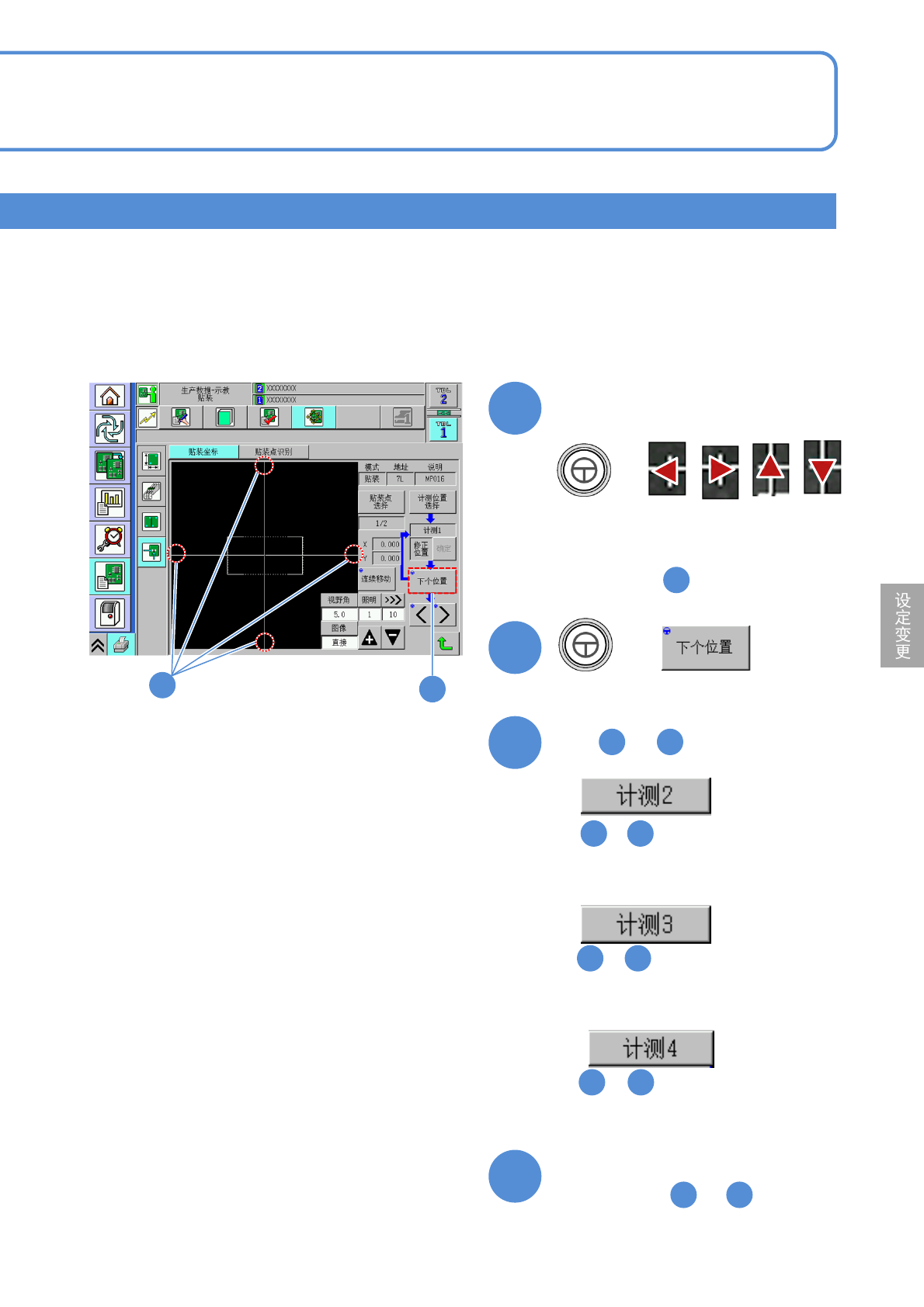 NPM-D3 EJM6DC-MB-06O-02 生产数据 校正 操作篇 6-2-9 贴装坐标校正 9 6-2-9 -17 元件位置指定的校正 1 1 2 2 4 确认提示 5 在 选择 5 ● 都需要进行。 中 ~ 的操作 进行「通过元件进行校正 ( 计测方 法 : 1 点 ) 」 1 7 4 3 + 3