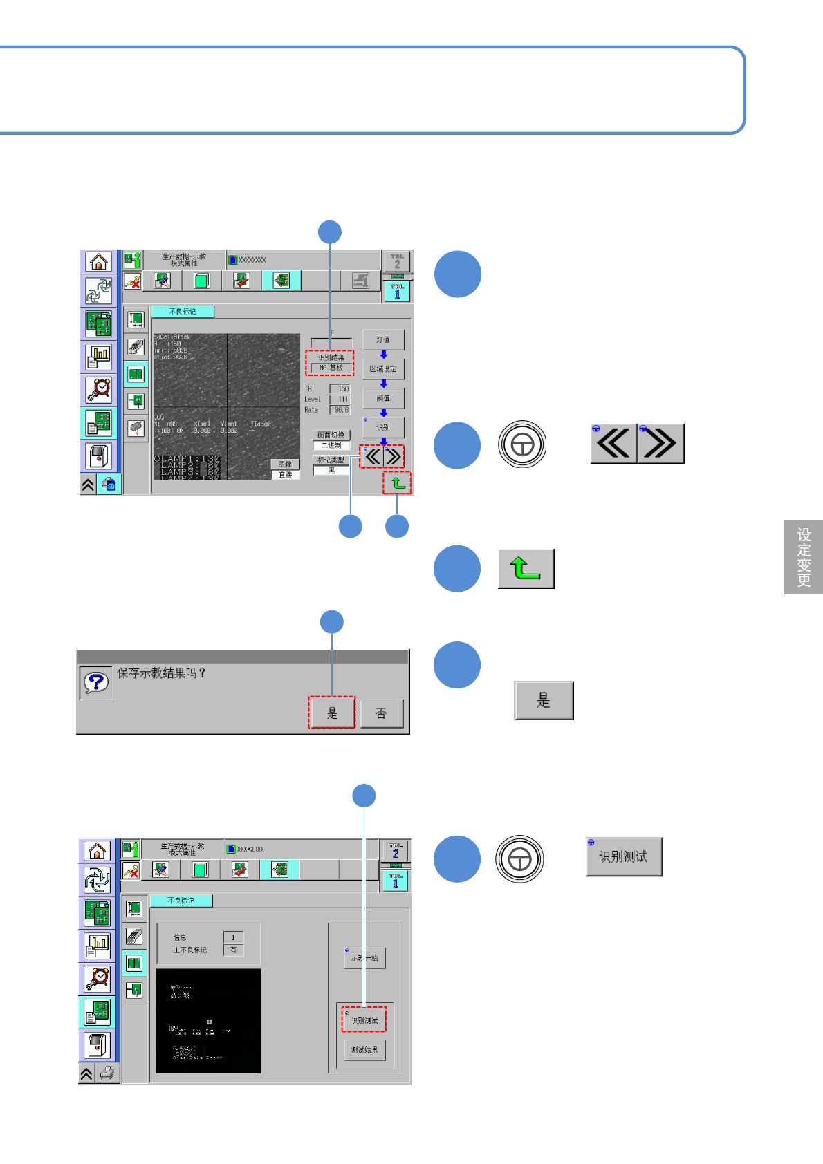 NPM-D3 EJM6DC-MB-06O-02 生产数据 校正 操作篇 6-2-10 6-2-10 -3 不良标记识别校正 2 5 5 5 6 ■当变更识别范围的位置或尺寸时 7 ■当变更识别阈值、切换画面、变更标 记类型时 6 8 7 + 8 变更结束后 (进行识别动作) ●调节亮度,使不良标记清晰可见。 ( → P.6-2-1 ‘ 指示灯值的调 整 ’) ■不良标记不在中央位置时 ●不良标记的中心和十字线的中心保 持一致。 +