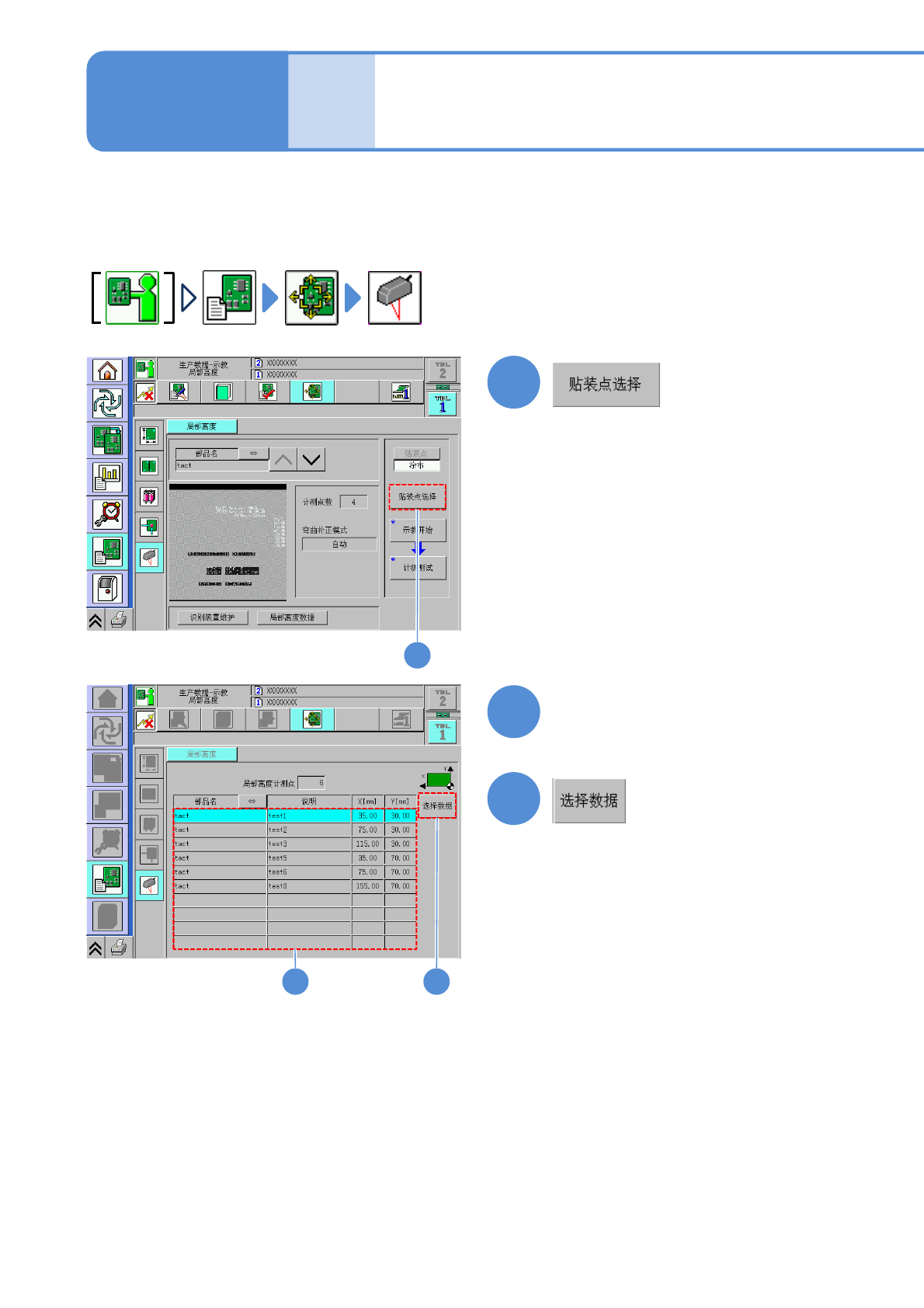 NPM-D3 EJM6DC-MB-06O-02 生产数据 校正 6-2-15 -3 局部高度校正 2 操作篇 6-2-15 1 1 在这里对有代表性的局部高度校正的 操作步骤进行说明。 以点胶头和高度传感器安装在前侧贴 装头时为例进行说明。 ●只有选择安装了高度传感器的工作 台时可以操作。 3 3 2 2 选择进行局部高度校正的对象数据