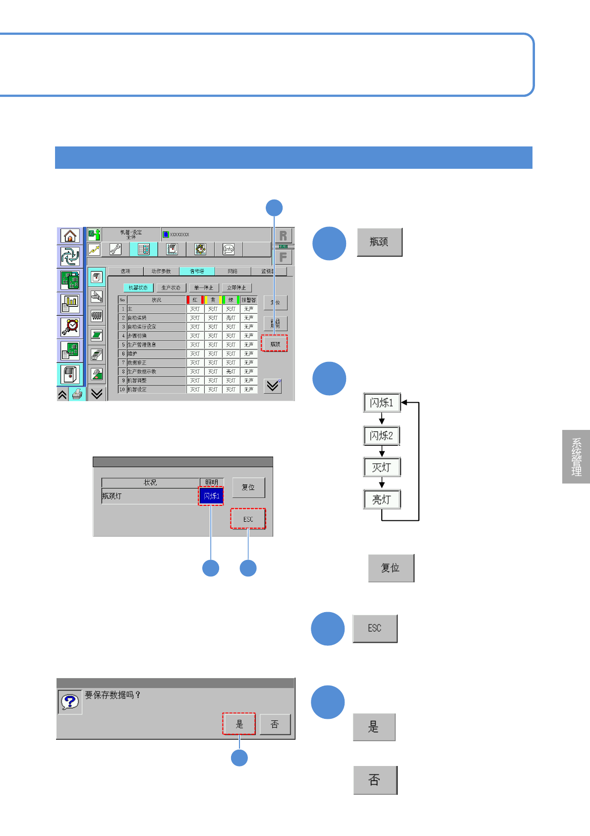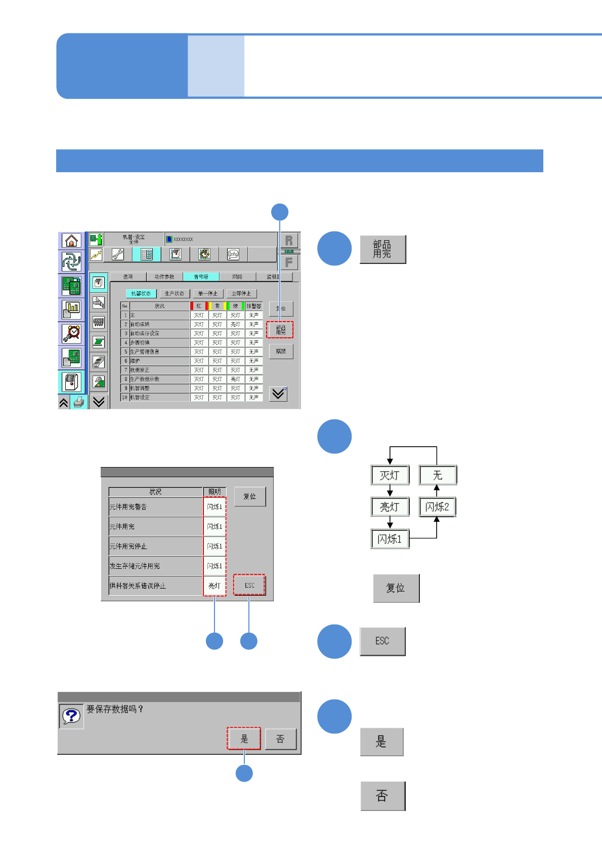 NPM-D3 EJM6DC-MB-07O-02 单元设定 信号塔的设定 2 操作篇 7-1-3 7-1-3 -3 元件用完 ●根据元件用完的各种状态来设定工 作台指示灯。 2 3 3 ( 返回原来画面 ) 1 1 2 选择各状况指示灯的设定 4 ■按下一个操作键 确认提示 ■设定为本公司的标准规格时 ( 被初始化 ) 4 ■不保存数据时