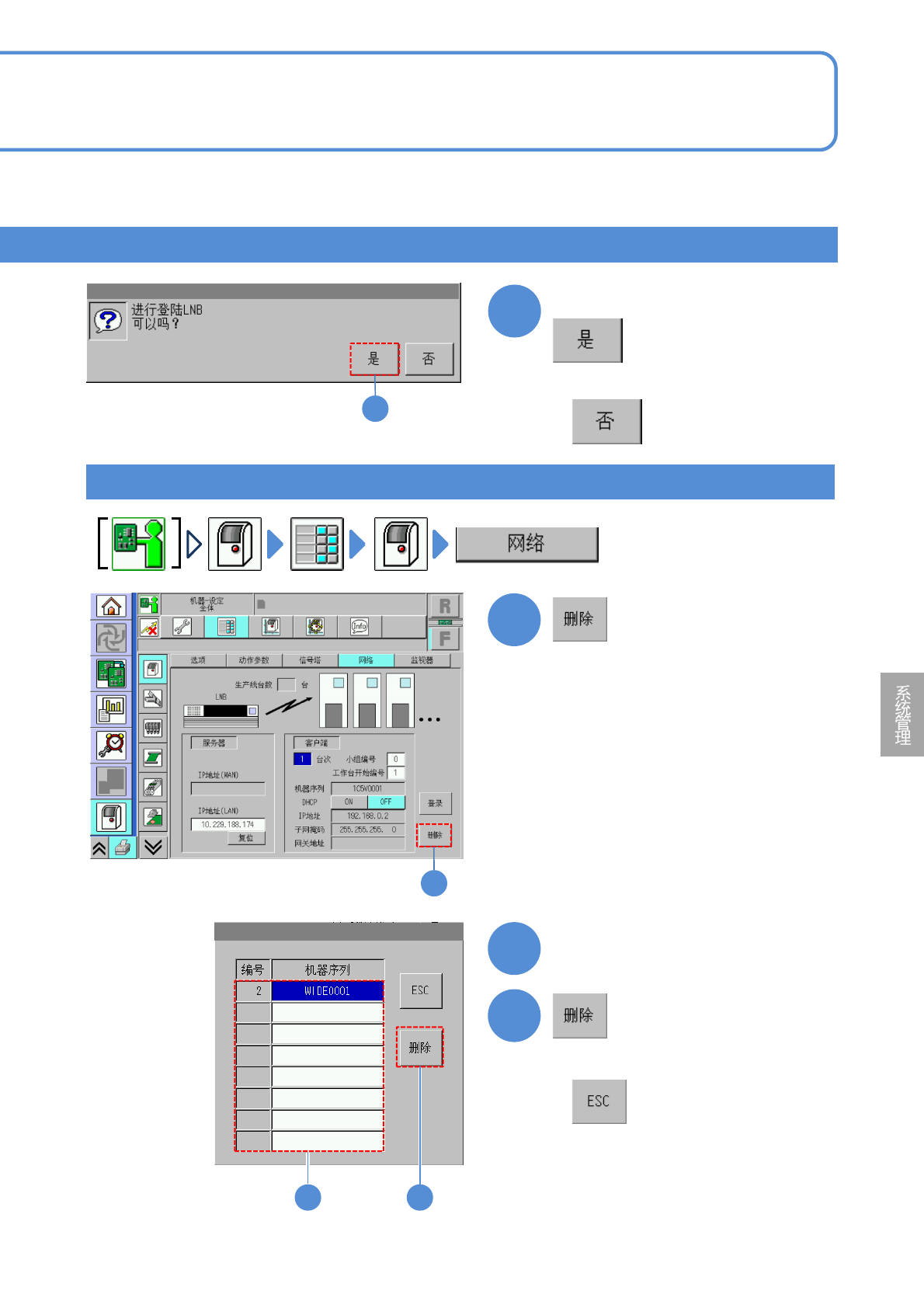 NPM-D3 EJM6DC-MB-07O-02 7-1-4 -2 3 3 3 1 1 2 3 2 选择设备编号 确认提示 ( 显示登录在 LN B 的设备一览 ) 删除设定 ■不登录时 ■不删除时