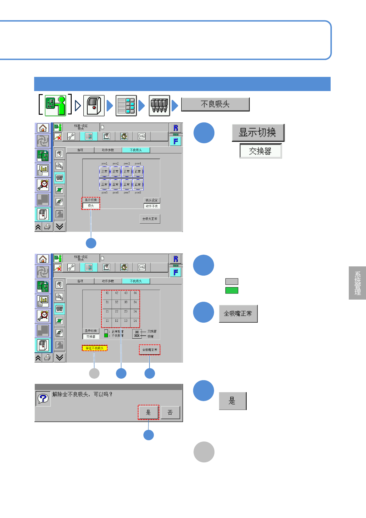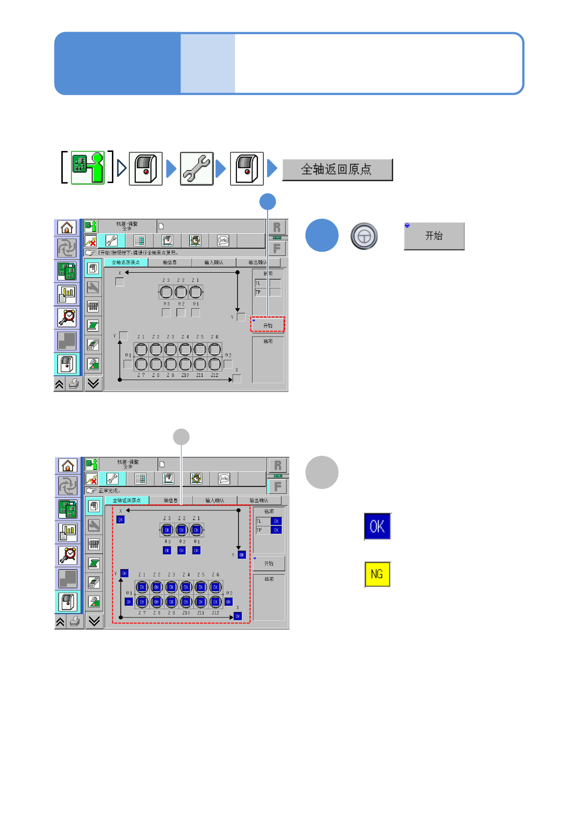 NPM-D3 EJM6DC-MB-07O-02 单元调整 操作篇 7-2-1 全轴的原点复位 1 ( 开始原点复位,显示结果 ) 进行全轴的原点复位。 + 1 原点复位的结果 A A ■原点复位成功的轴 ■原点复位失败的轴 ●请向本公司咨询。 7-2-1 -1