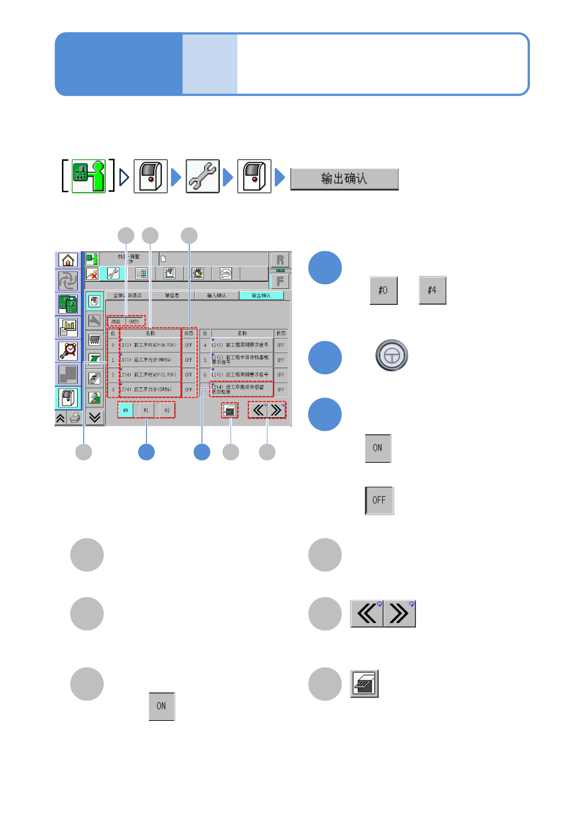 设备中使用的所有输出地址的状态以各BIT名称表示,确认其名称,根据需要来切换ON或OFF。