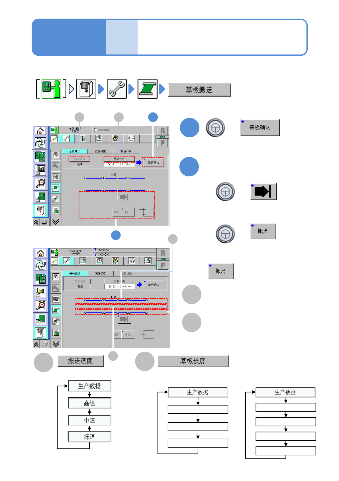 NPM-D3 EJM6DC-MB-07O-02 单元调整 基板的传送确认 选择基板长度。 ( 传送带上有基板时,会显示位置 ) 对基板的传送动作是否正常进行确认 。 ●使用双轨模式时,事先选择轨道。 1 B + 选择传送速度。 A ■没有来自后工序的要求信号而传出 时 成为有效。 ( 基板被传送到选择位置 ) 2 + 传送 ■传入到设备内时 + ■传出到设备外时 A 1 B 2 操作篇 7-2-9 7-2-9 ■ 单轨模式的情况下 C …