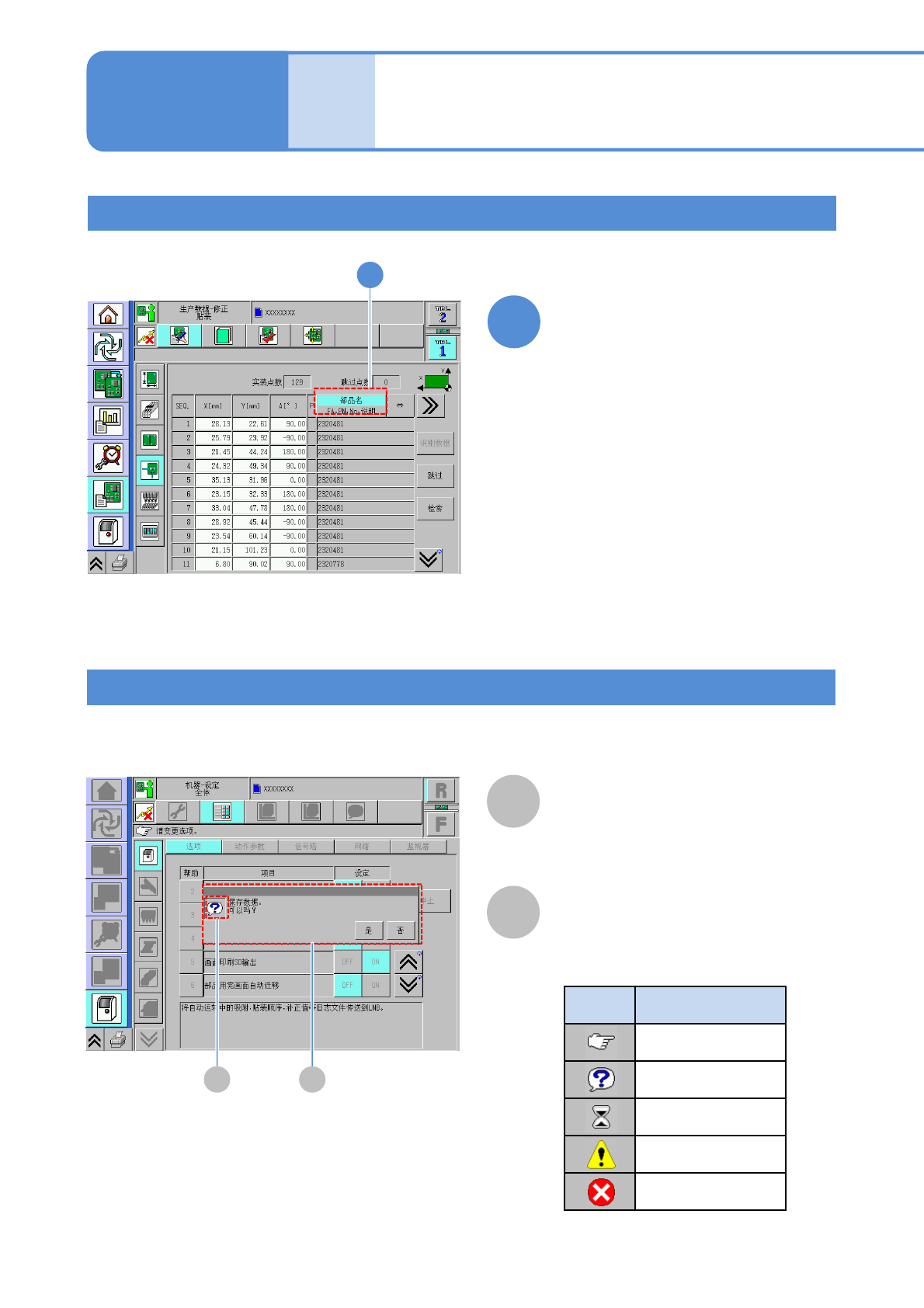 NPM-D3 EJM6DC-MB-02O-02 2-2-1 -5 各部位 名称 触摸屏 3 经常使用的操作 ■切换显示模式时 1 ●每按一次,翻转显示上下移动,切 换模式。 选择显示模式 1 提示信息 ( 自动 ) A A 提示信息 B 提示图标 根据状况显示提示信息。 ●提示图标的种类 图标 意义 指示 问讯 等待 危险、警告、注意 禁止 B 操作篇 2-2-1