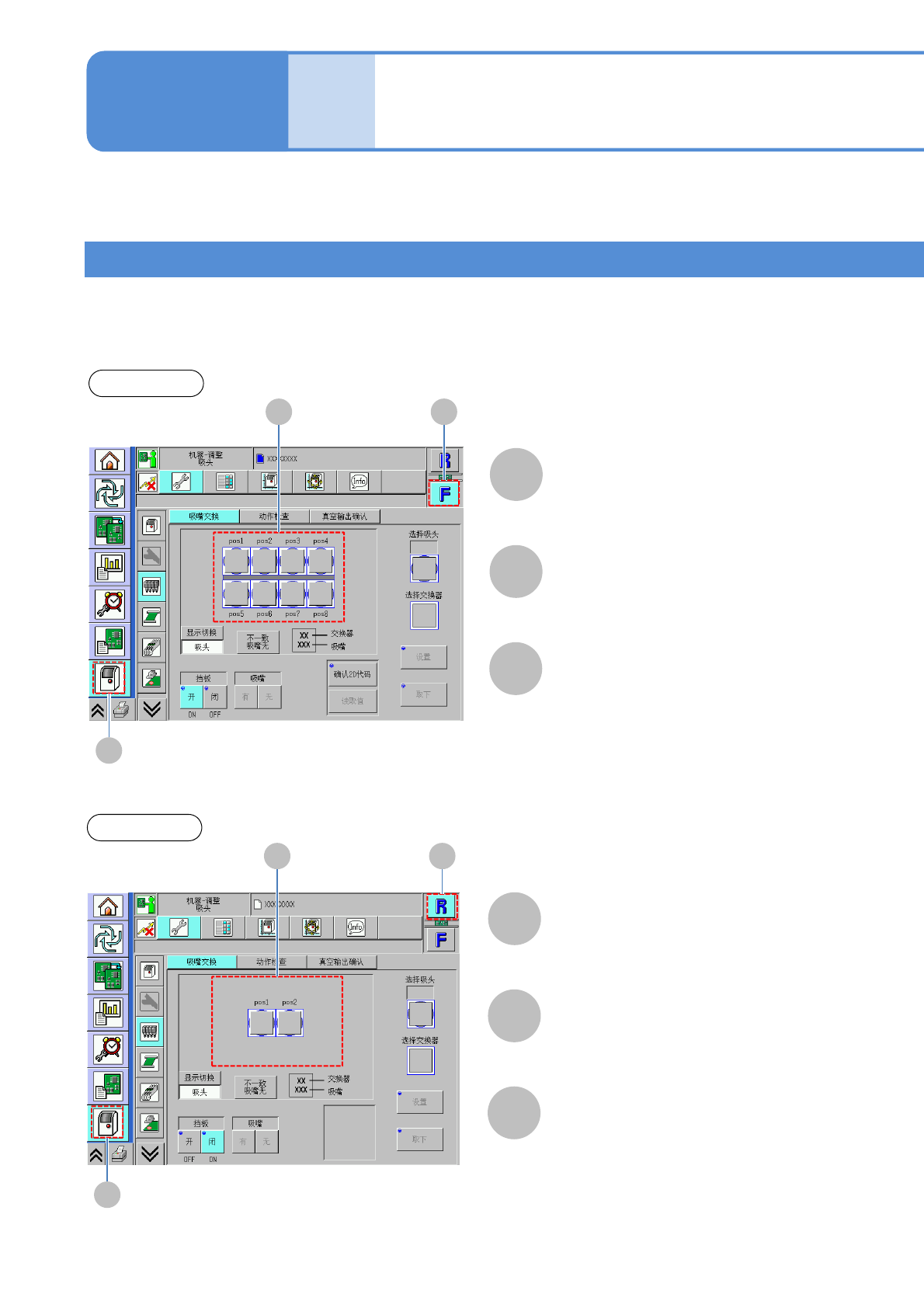 NPM-D3 EJM6DC-MB-02O-0 2 2-2-1 -6 工作台 / 基台的切换显示 1 NPM-D3 在前后配置 XY 单元,按画面右上键进行操作 的切换。 有关工作台的切换键,根据以下条件 会有变化。 ●所选择的第 1 层的按键 ●设备连接为生产线时所处的位置 ■基台的切换显示 ( 第 1 层是 时 ) 1 1 或者 ■工作台的切换显示 ( 第 1 层是 以外时 ) 1 ( 所显示的工作台被切换 ) 1 A B ●设备即使…