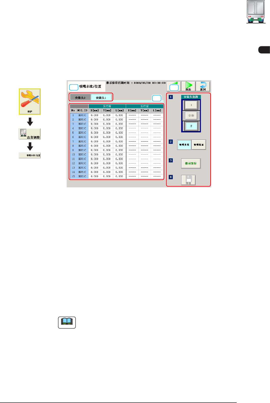 3OM-1602 第一章 5. 生产 ( 出厂 ) 调整 1-59 1 103-003 5.15 吸嘴水准 / 位置 吸嘴水准 对贴装在安装头的通常吸嘴的吸嘴下面水准的补正值进行教示。 吸嘴位置 对安装头旋转中心和吸嘴顶端位置的基准值的偏差进行教示。 [2] [1] [3] F3A39 [1] 安装头切换 Tab 切换各教示对应的安装头显示界面。 [2] 教示数据显示部 显示指定安装头吸嘴的教示数据。 [3] 教示步骤显示部 配置有教示…