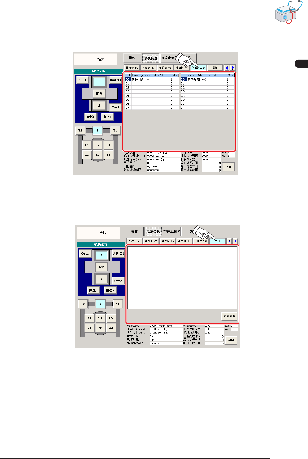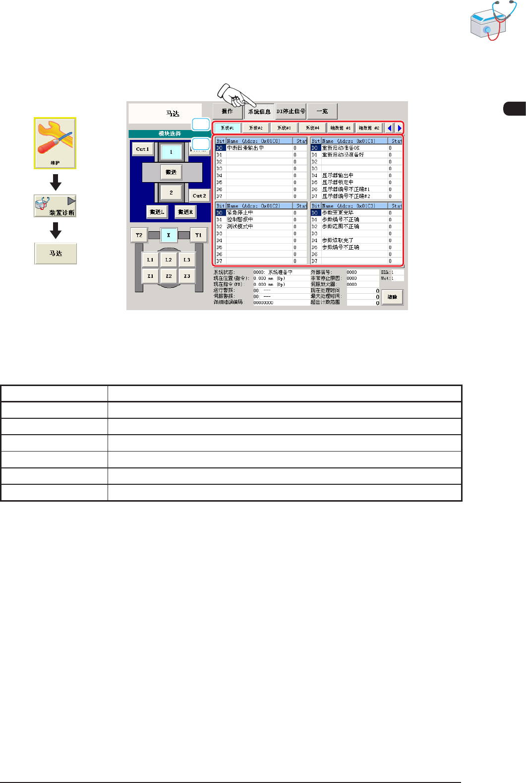 3OM-1602 1-76 第一章 6. 装置诊断 [2] 状态显示 显示各部分的状态。 (1) 系统 #1、系统 #2、系统 #3、系统 #4 显示作为 “ 系统信息 ” 界面初始显示的 “ 系统 #1 ” 界面。 F3A51 (2) 轴数据 #1、轴数据 #2、轴数据 #3、轴数据 #4 F3A52 1201-003