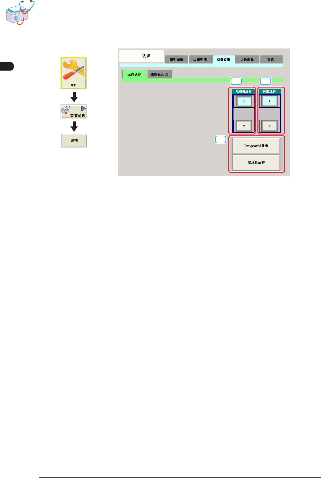 3OM-1602 1-90 第一章 6. 装置诊断 6.3.3.1 元件认识 ( 识别 ) 在 “ 图像读取 ” 选项卡,按下 [ 元件认识 ]Tab,便显示以下界面。 [1] [2] [3] F3A69-1 [1] 照相机选择 配置有表示元件识别照相机位置的按钮。 选择进行图像读取的元件识别照相机。 [2] 横梁选择 选择想要进行确认的横梁。 [3] Trigger 线检查 确认进行图像读取的 Trigger 线。 照相机检查 进行照…