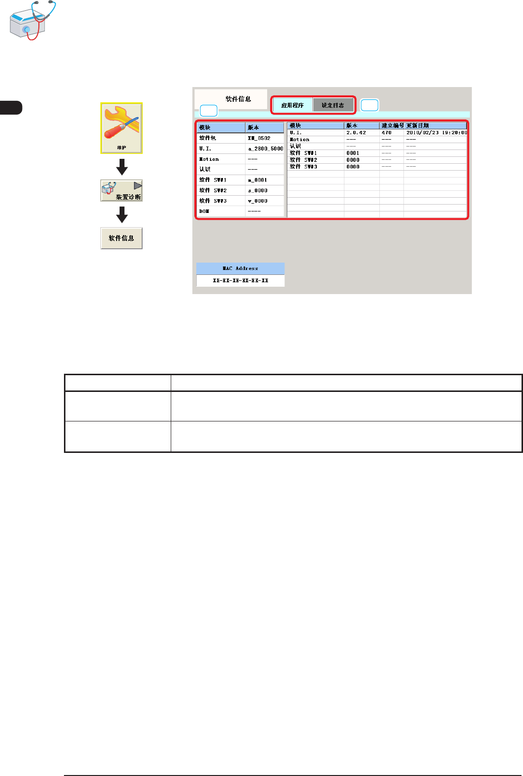 可以显示装置当前的应用程序信息和设定日志等。