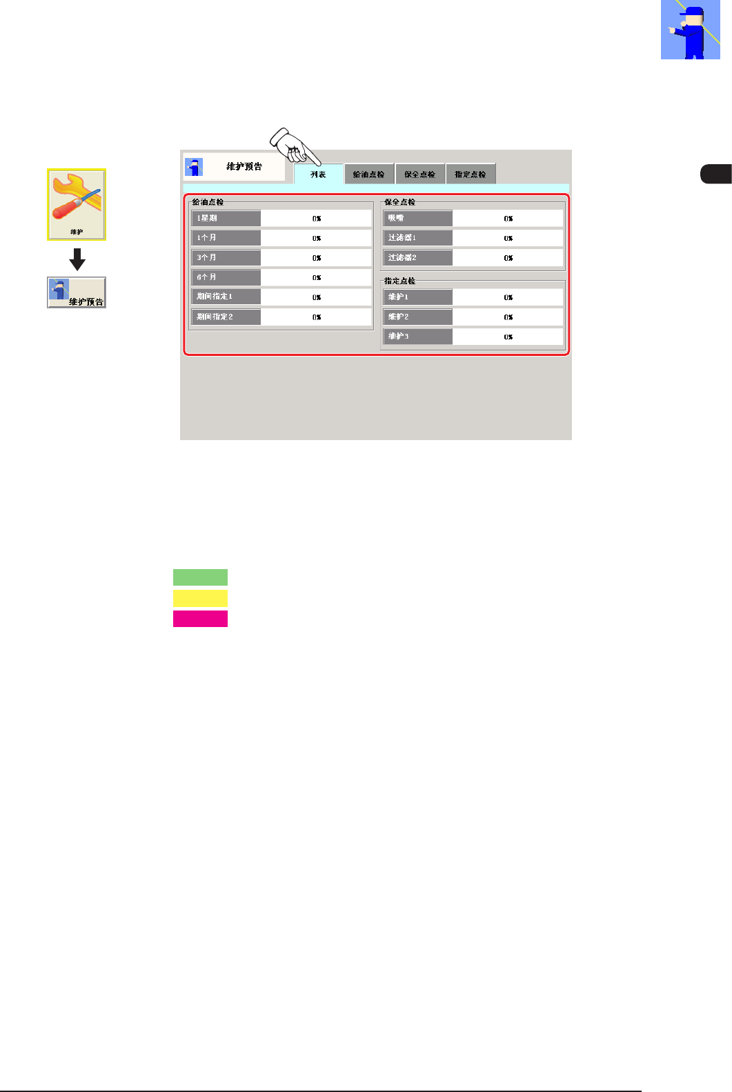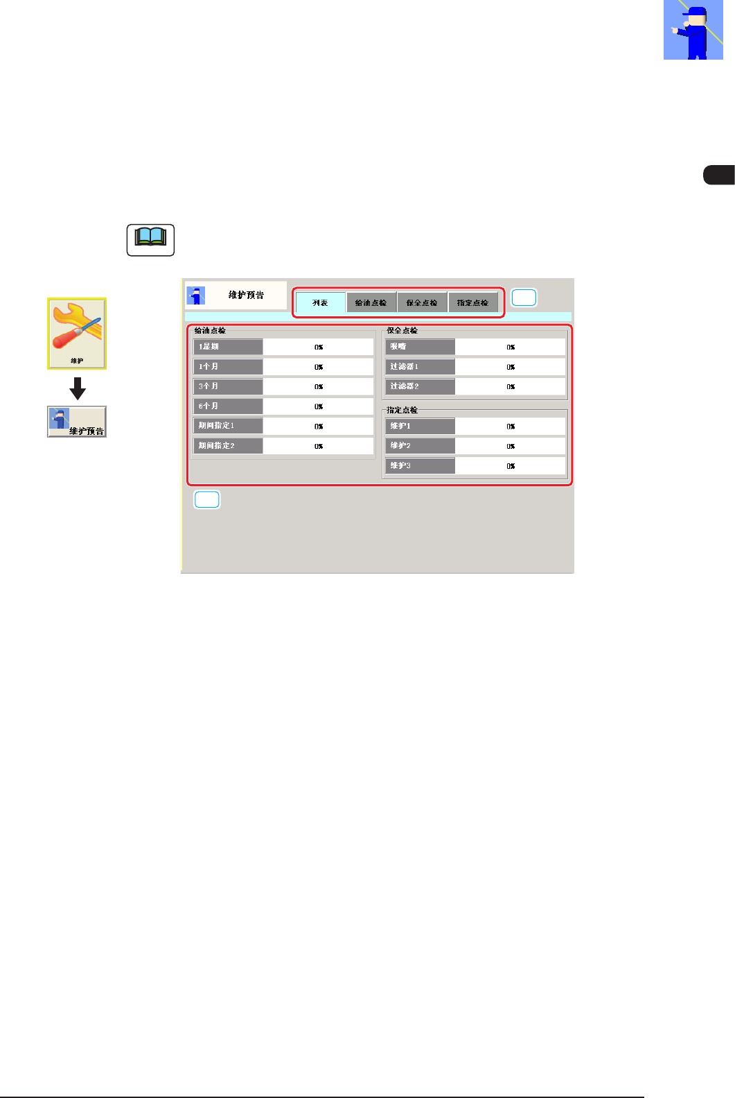 3OM-1602 1-100 第一章 7. 维护预告 [1] Tab “ 维护预告 ” 界面分为以下 4 个选项卡,按下 Tab,便显示各界面。 Tab 内 容 列表 用百分比 (%) 显示给油点检、 保全点检、 指定点检各项目的当前状况。 给油点检 显示给油点检的维护周期 (1 星期、1 个月、3 个月、6 个月、365 日 ) 的实施日。 保全点检 作为维护项目,对吸嘴、过滤器 1( 安装头过滤器 )、过滤器 2( 气源 过滤器 )…