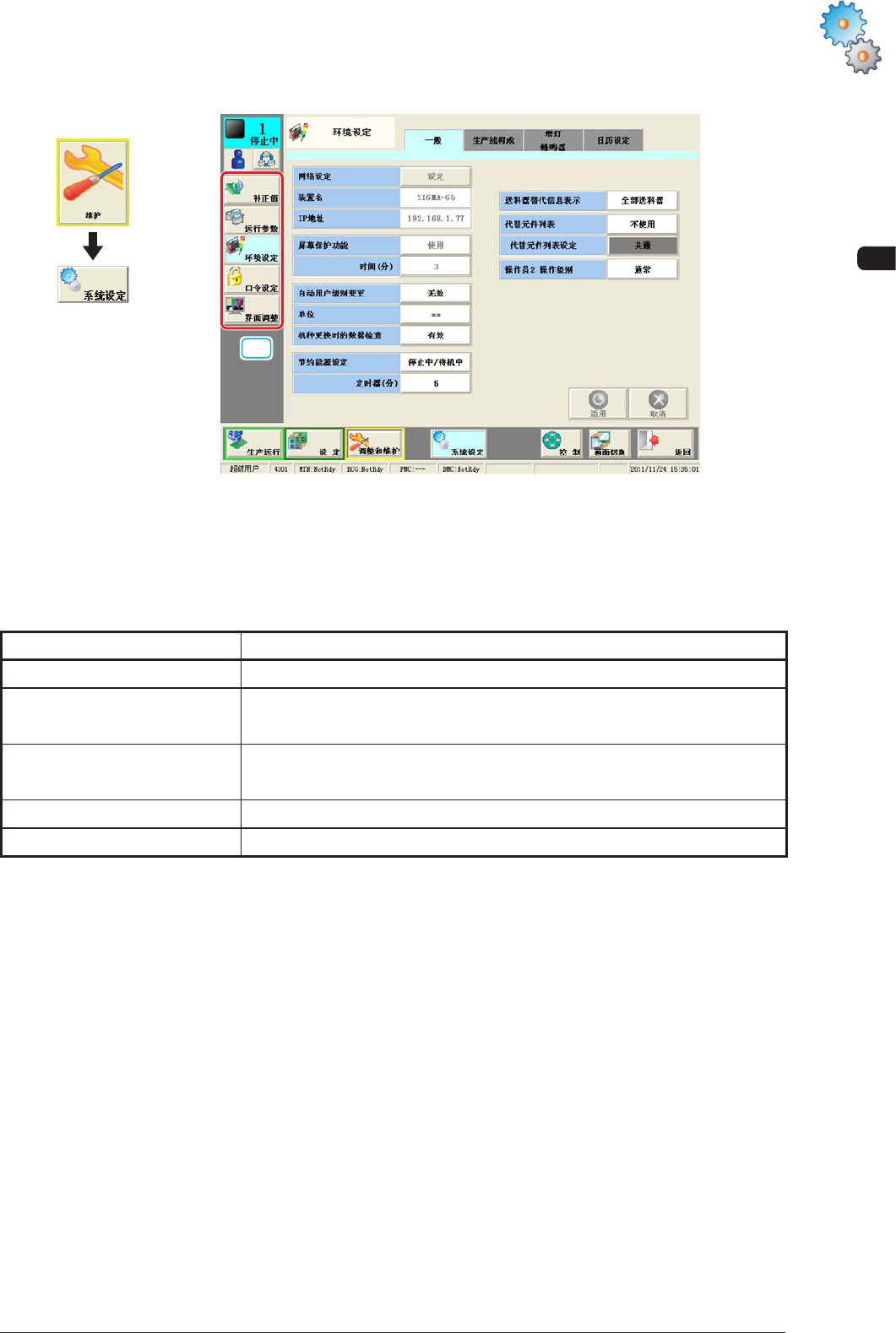 环境设定 进行屏幕保护功能的设定、单位的切换、生产运行中的数据编辑