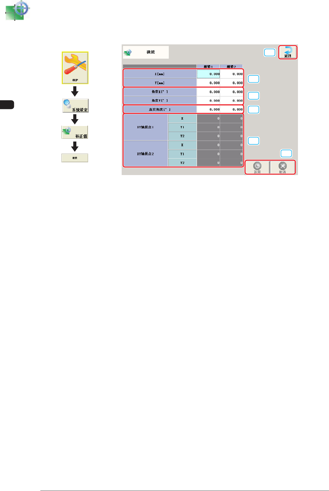 将横梁 X 及 Y 轴对准装置基准坐标系的数据。