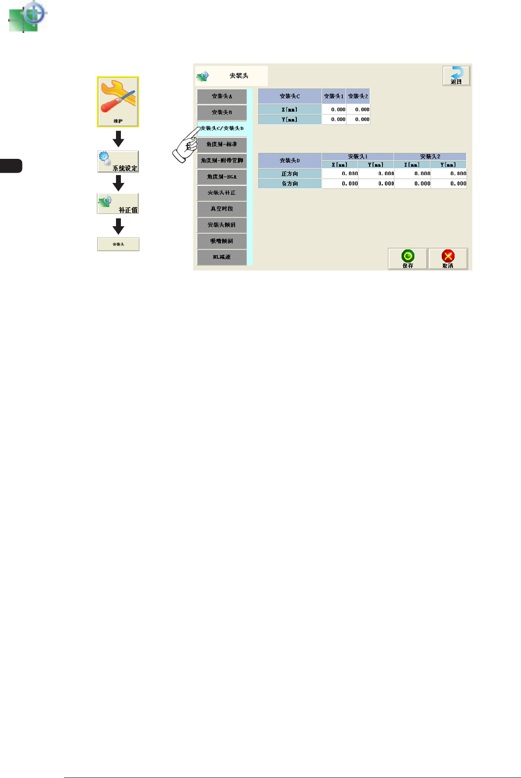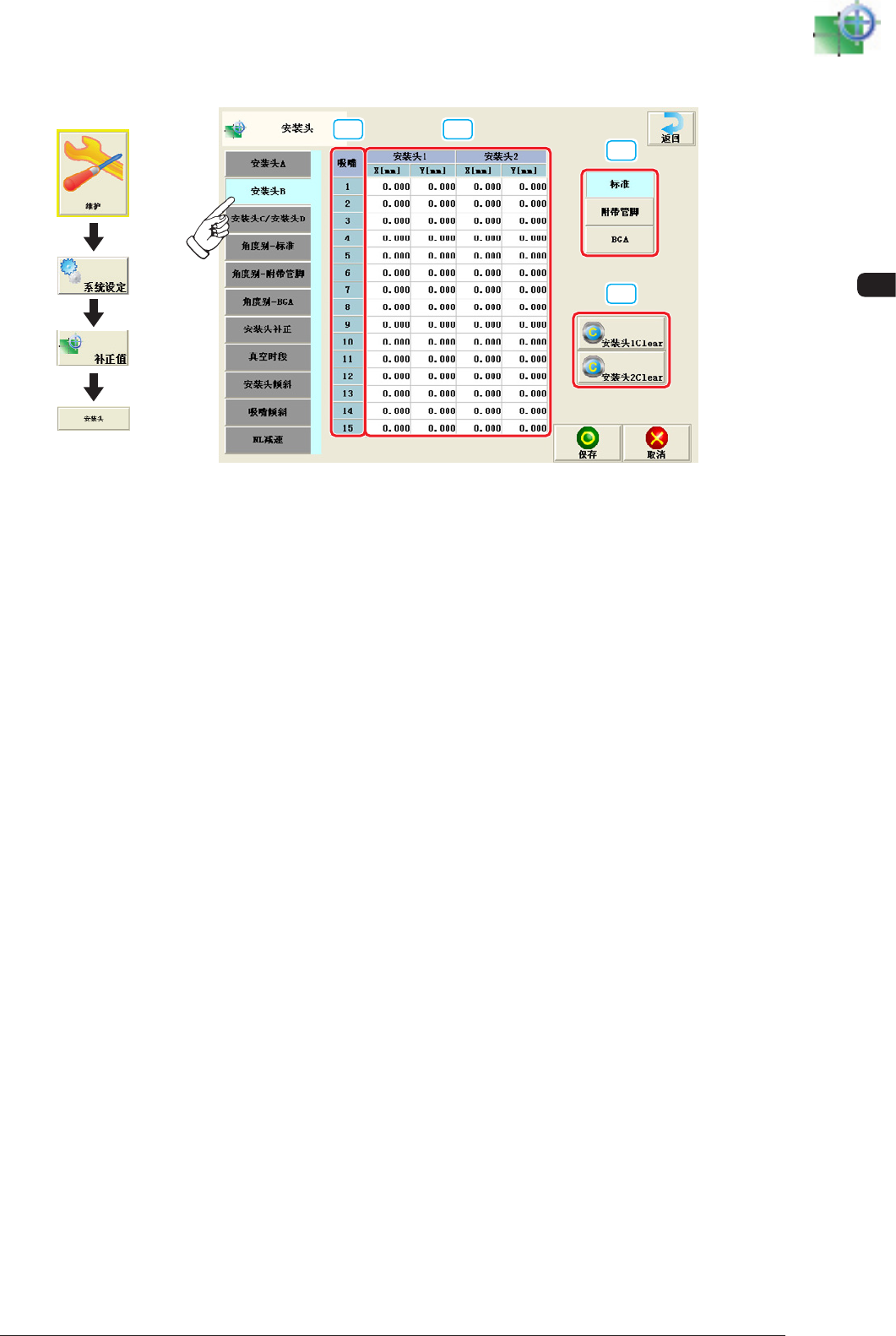 3OM-1602 第二章 2. 补正 ( 补正值 ) 数据 2-29 2.5.2 安装头 B [1] [2] [3] [4] F3B24 [1] 吸嘴 1 ~ 15 显示各吸嘴号。 [2] 安装头 1、2 X、Y[mm] 调整吸嘴升降轴动作引起的吸嘴位置偏离。 [3] [ 标准 ] 按钮 适用元件为标准元件时,计算贴装目的位置时被变换、加算。 [ 附带管脚 ( 带引脚 )] 按钮 适用元件为带引脚元件时,计算贴装目的位置时被变换、加算。…