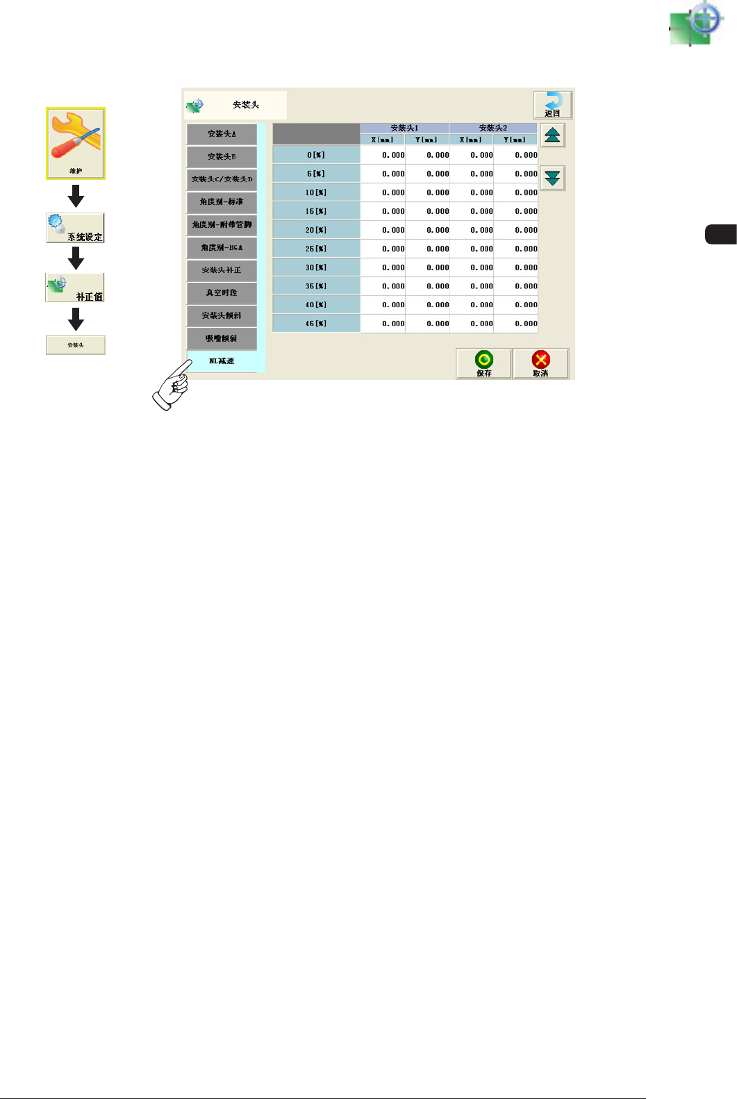 根据吸嘴轴的倾斜、补正 NL 轴下降时发生的 X、Y 偏离量。