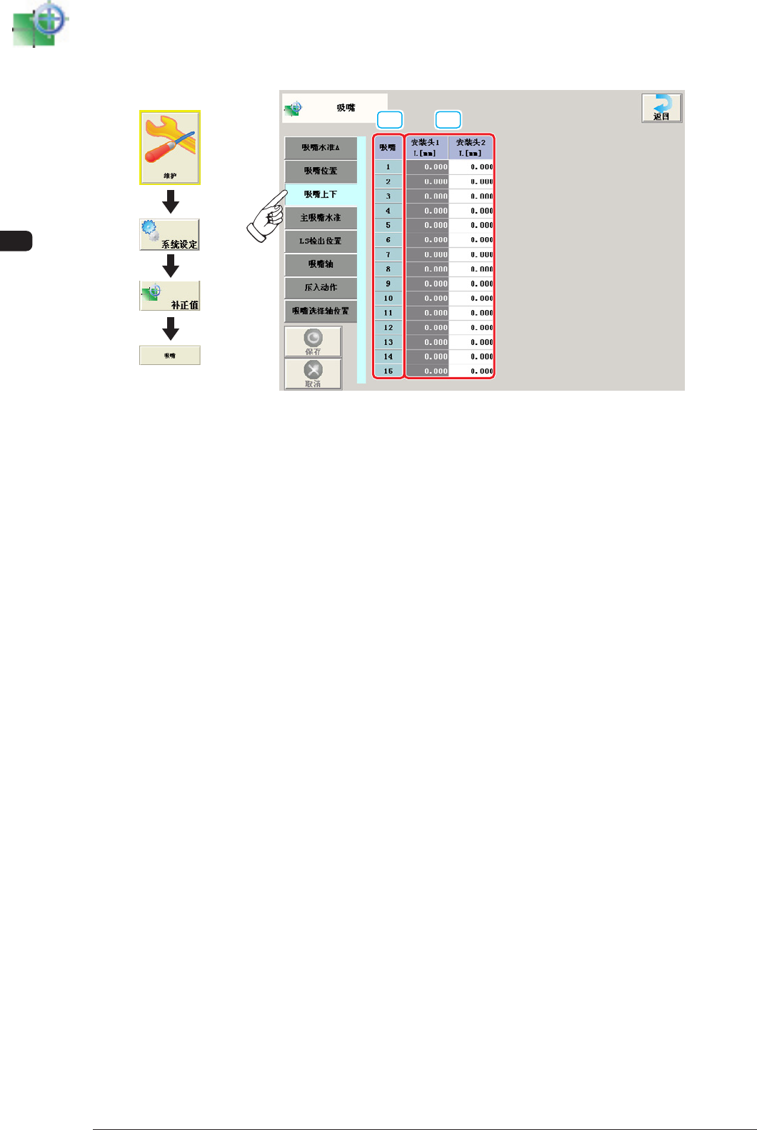 是吸嘴上面和吸嘴上下控制杆的设计值差距的补正值数据。