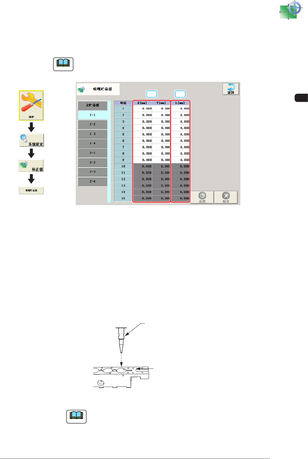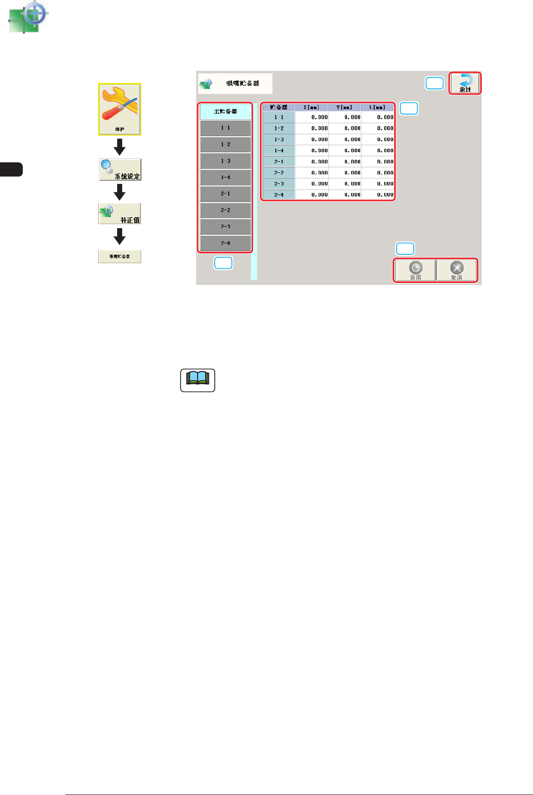 3OM-1602 2-52 第二章 2. 补正 ( 补正值 ) 数据 2.7 吸嘴贮备器 ( 储料器 ) [4] [3] [2] [1] F3B45 [1] 补正值按钮 显示选中 Tab 的补正值数据。 Note 用 “ 主贮备器 ” 按钮显示 1-1 ~ 1-4、2-1 ~ 2-4 的设定。 [2] 补正值数据显示部 显示 [1] 中选择的补正值数据。 [3] [ 返回 ] 按钮 返回到 “ 补正值数据 ” 界面。 [4] [ 适用 …