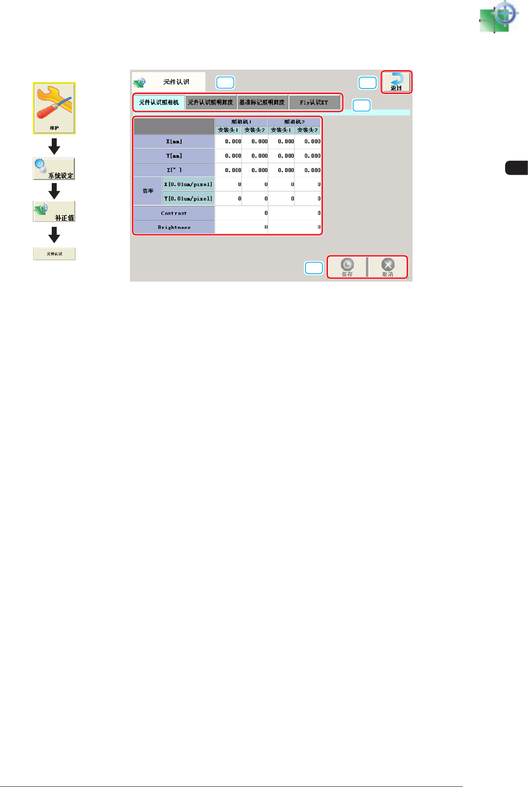 3OM-1602 2-56 第二章 2. 补正 ( 补正值 ) 数据 倍率 X( 横 )、Y( 纵 )[0.01 µ m/pixel] 是设定线路板识别照相机倍率的数据, 用来设定 1 像素相当于多少微米。 该补正值在倍率测定用治具的教示操作下自动被算出。 • 初始值 : 2500 Contrast( 对比度 )、Brightness( 亮度 ) 调整线路板识别照相机摄像的图像的亮度。 • 初始值 Contrast :102 Brigh…