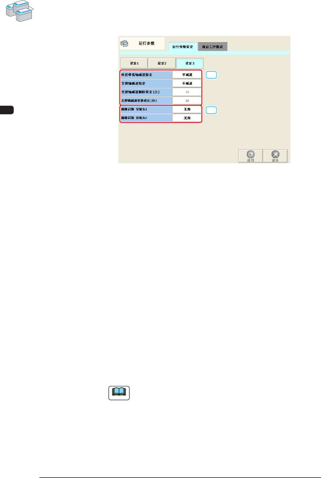 3OM-1602 2-72 第二章 3. 运行参数 1201-001 • 设定 3 [1] [2] F3B61-1 [1] 传送带宽轴减速指定 从以下选择传送带宽度轴的减速指定。 不减速 10% 减速 20% 减速 30% 减速 40% 减速 50% 减速 60% 减速 70% 减速 80% 减速 90% 减速 支撑轴减速指定 不减速 10% 减速 20% 减速 30% 减速 40% 减速 50% 减速 60% 减速 70% 减速 80…