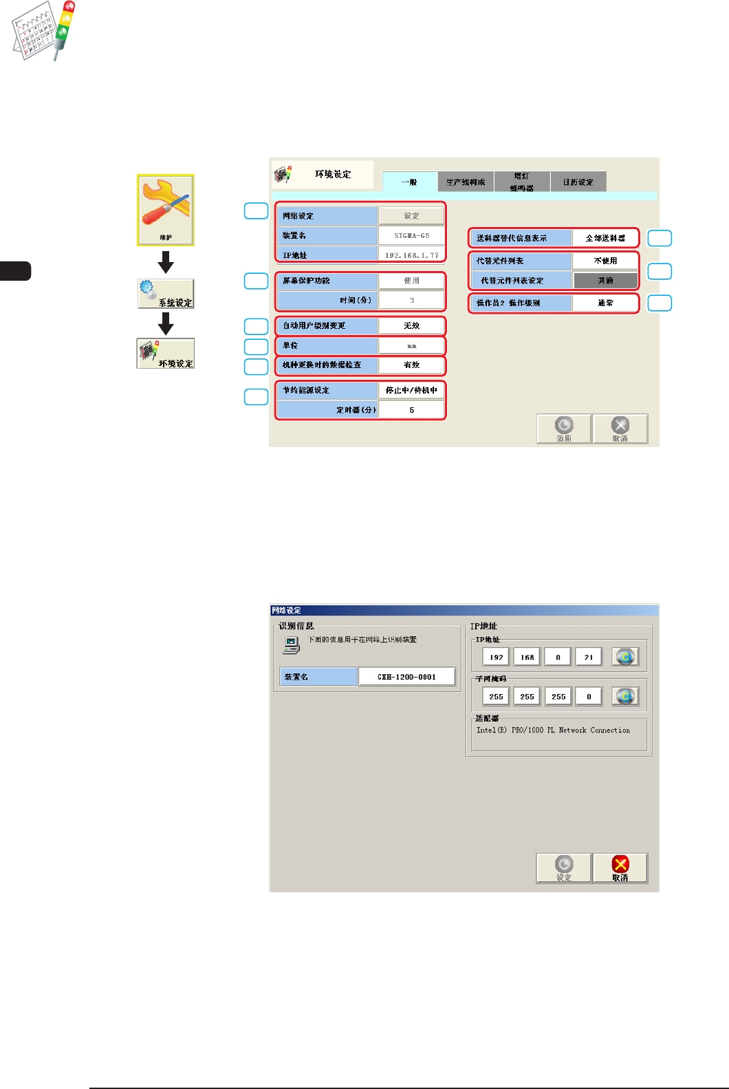 3OM-1602 第二章 4. 环境设定 2-77 [ 设定 ] 按钮 设定输入的值。 [ 取消 ] 按钮 取消输入的值,恢复保存的数据。 装置名 显示装置名。 IP 地址 显示分配到装置的 IP 地址。 [2] 屏幕保护功能 将装置放置一定的时间而不操作时,为了保护触摸屏而启动屏幕保护 功能。 进行使用、不使用屏幕保护功能的设定。 时间 ( 分 ) 设定屏幕保护功能的开始时间。 [3] 自动用户级别变更 登录用户级别为超级超乎或管理员…