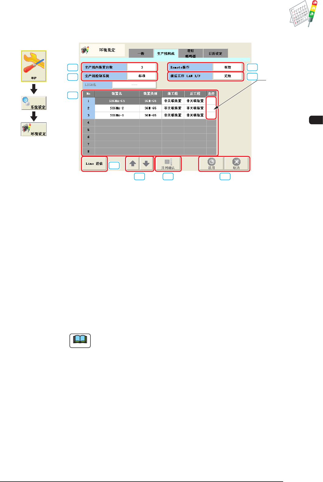 3OM-1602 第二章 4. 环境设定 2-79 4.2 生产线构成 [6] [2] [1] [3] [4] [5] [7] [8] [9] 移动 单元格 F3B65 [1] 生产线内装置台数 设定生产线内的装置台数。 [2] 生产线控制系统 从下面选择生产线内的操作系统并进行设定。 标准 : 通常选择标准。 LISA : 购买并使用 LISA 基本包 ( 选项 ) 时选择 LISA。 [3] Remote 操作 从生产线内的装置设定…