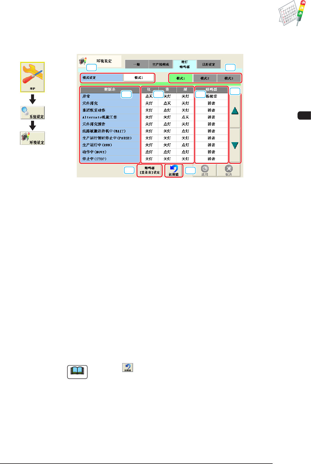 3OM-1602 第二章 4. 环境设定 2-81 4.3 塔灯、蜂鸣器 设定塔灯色和警告音。 [1] [2] [3] [4] [5] [6] [7] [8] F3B66 [1] 模式设定 切换模式。 [2] 塔灯设定选择 [ 模式 1]、[ 模式 2]、[ 模式 3] 显示按钮。 可以保存塔灯的设定图形。 按下按钮,图形被切换。 [3] 数据名 显示设定塔灯色 ( 红、黄、绿 ) 和警告音的项目。 [4] 红、黄、绿 设定塔灯色 ( …