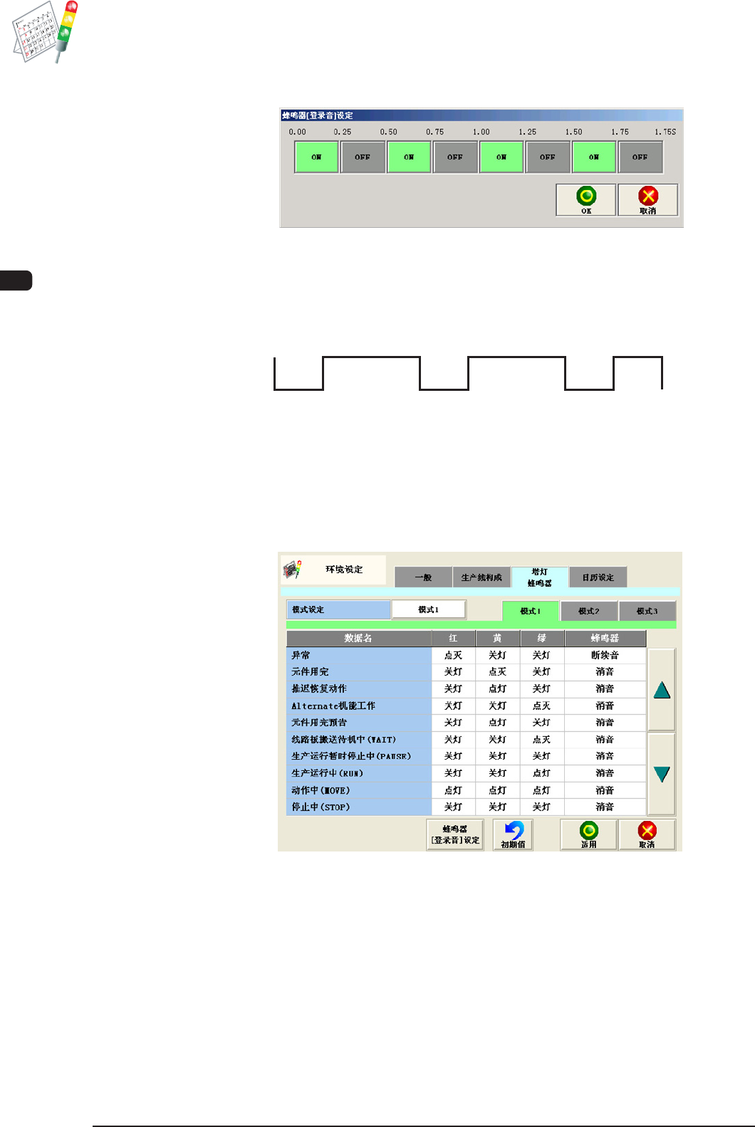 显示设定塔灯色 ( 红、黄、绿 ) 和警告音的项目。
