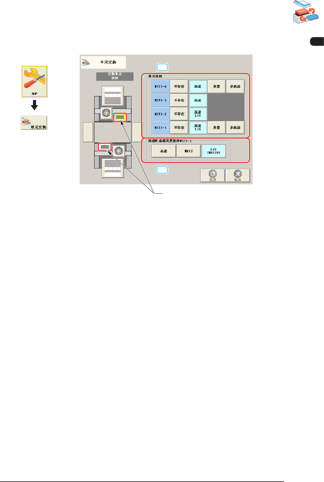 [ 异型 ] 按钮 : 切换到中异型吸嘴储料器 ( 选项 )。