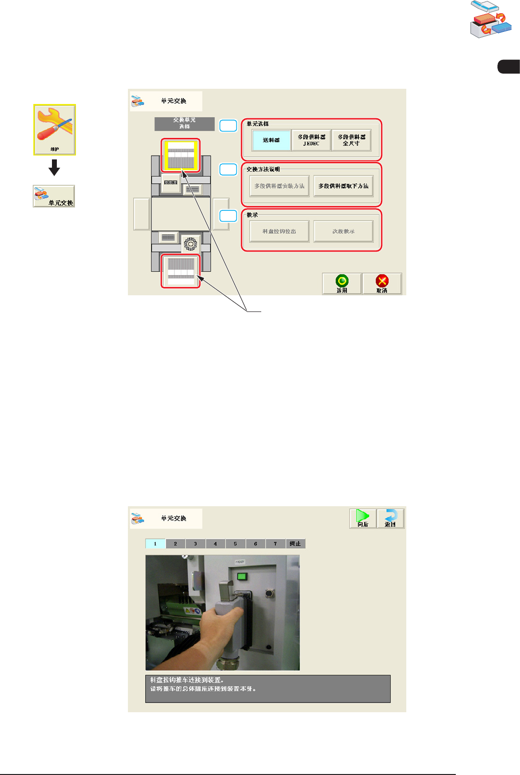 3OM-1602 第一章 3. 单元交换 1-9 1201-004 3.3 送料器单元 按下送料器单元按钮,便显示以下界面。 [1] [2] [3] 送料器单元按钮 F3A8 [1] 单元选择 [ 送料器 ] 按钮 : 切换到送料器。 [ 多段供料器 JEDEC] 按钮 : 切换到 JEDEC 尺寸的多段供料器 ( 选 项 )。 [ 多段供料器 全尺寸 ] 按钮 : 切换到全尺寸的多段供料器 ( 选项 )。 [2] 交换方法说明 显示 …
