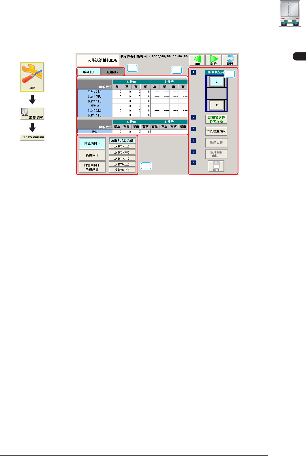 3OM-1602 1-32 第一章 5. 生产 ( 出厂 ) 调整 1201-003 [4] 教示步骤显示部 配置有教示中使用的按钮。 照相机选择 选择进行教示的照相机。 [XY 横梁退避位置移动 ] 按钮 将 XY 横梁移动到退避位置。 [ 治具设置确认 ] 按钮 确认治具设置的按钮。 [ 教示实行 ] 按钮 进行选中照相机的教示。 [ 治具取除 ( 拆取 ) 确认 ] 按钮 确认治具拆取的按钮。 [ 保存 ] 保存教示结果。 • 元…