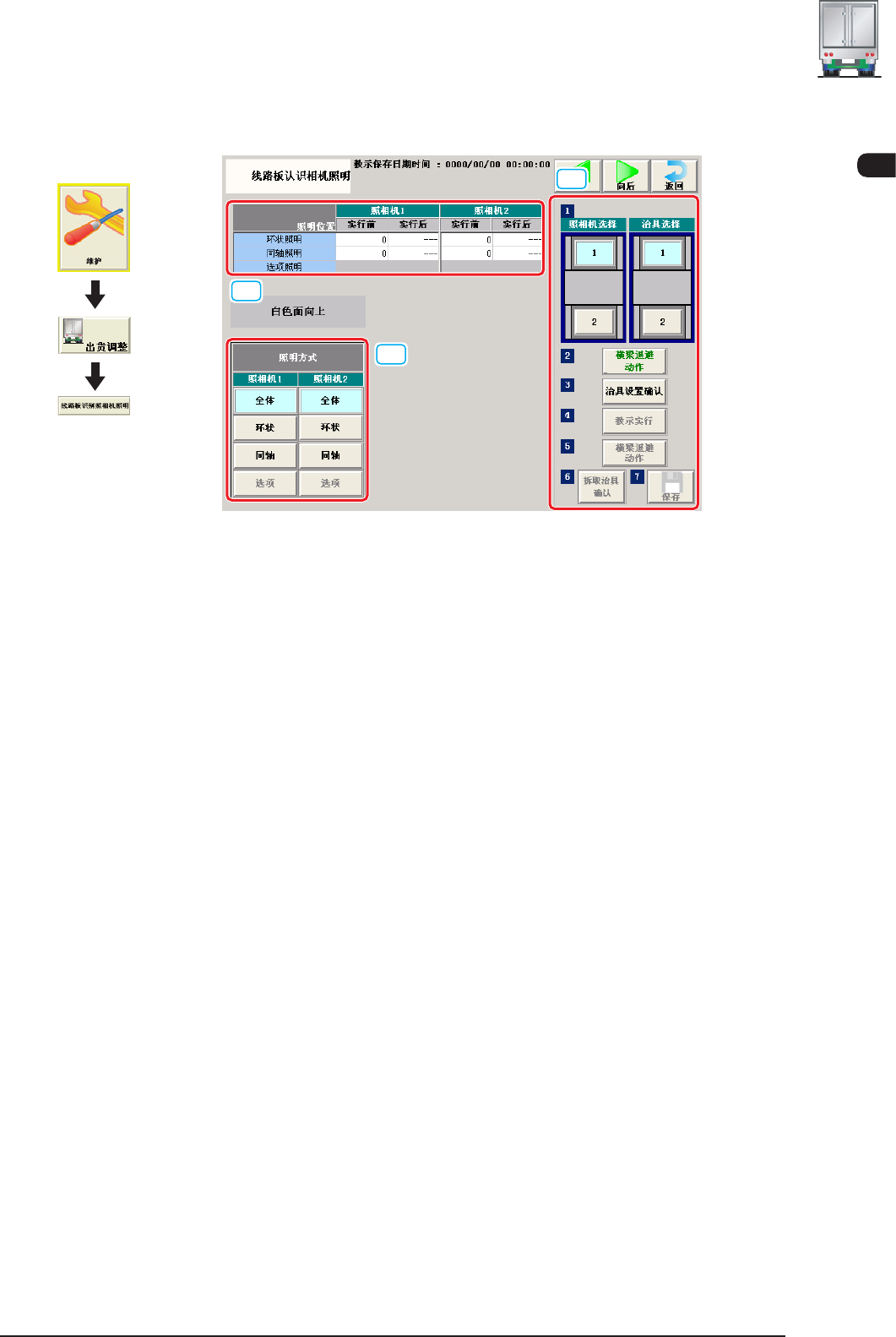 3OM-1602 1-36 第一章 5. 生产 ( 出厂 ) 调整 1 103-003 [ 拆取治具确认 ] 按钮 确认治具拆取的按钮。 [ 保存 ] 按钮 保存教示结果。 [3] [ 照明方式 ] 按钮 从以下项目选择照相机 1、照相机 2 的照明方式。 全体 : 进行环状照明、同轴的教示。 环状 : 进行环状照明的教示。 同轴 : 进行同轴照明的教示。 • 线路板识别照相机照明教示用治具 进行线路板识别照相机照明的教示时,使用如下治…