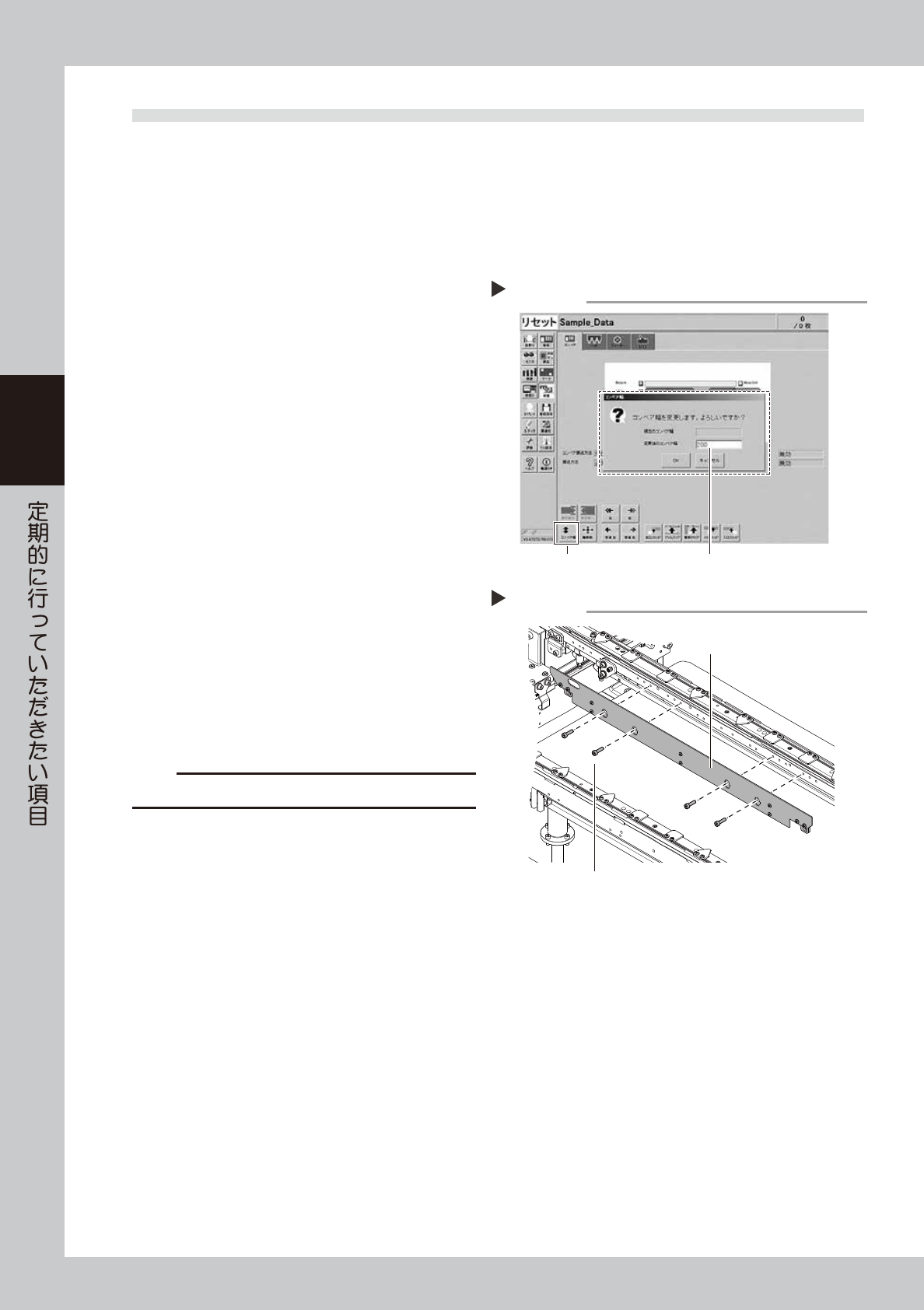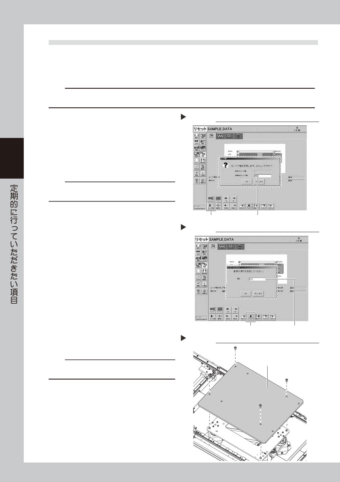 3-27 3 5 新しいグリスを塗布します。 ボールスクリュー 指定のグリス (NSL) を指に 2cm ほど付けて、 ボー ルスクリューのリードにまんべんなくすり込みま す。 ボールガイド 指定のグリス (NSL) を指に 2cm ほど付けて、 ボー ルガイドにまんべんなく塗ります。 51346-L1-00 6 グリスをなじませます。 1. マシンの安全カバーを閉め、非常停止を解除 します。台車仕様の場合には、台車をセット します。…