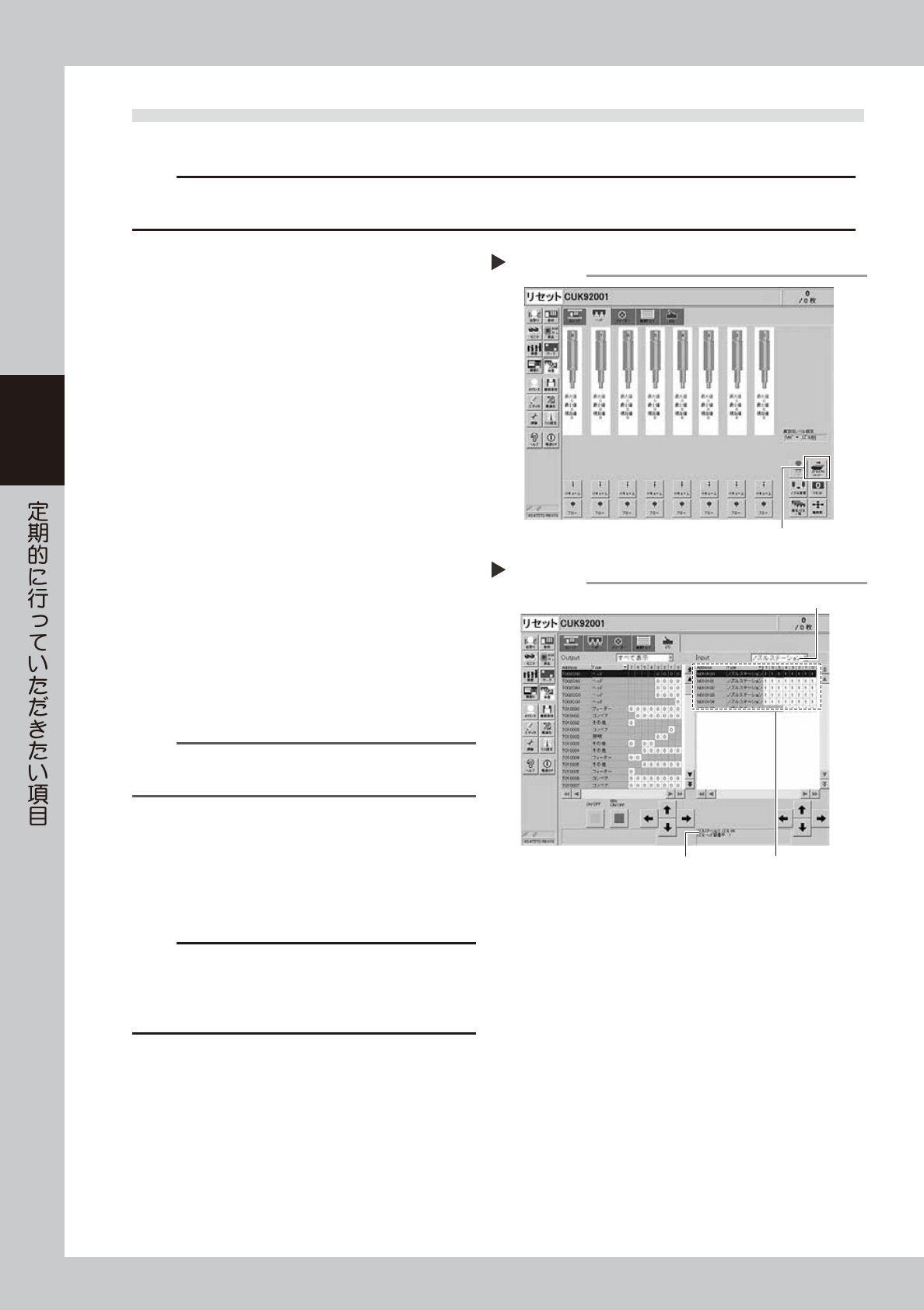 3-50 3 6.2 ノズルステーションセンサーの状態確認 ( オプション ) ノズルステーション ( オプション ) を装備しているマシンのノズルステーションセンサーの状態を確認します。 c 注意 ノズルステーションセンサーでノズル検出が正常にできない場合は、ノズルチェンジが正しく動作しなかったり、ノズル検出エ ラーにより運転の継続ができなくなる場合があります。 1 ノズルステーションのシャッターを開 きます。 1. [ 装置 …