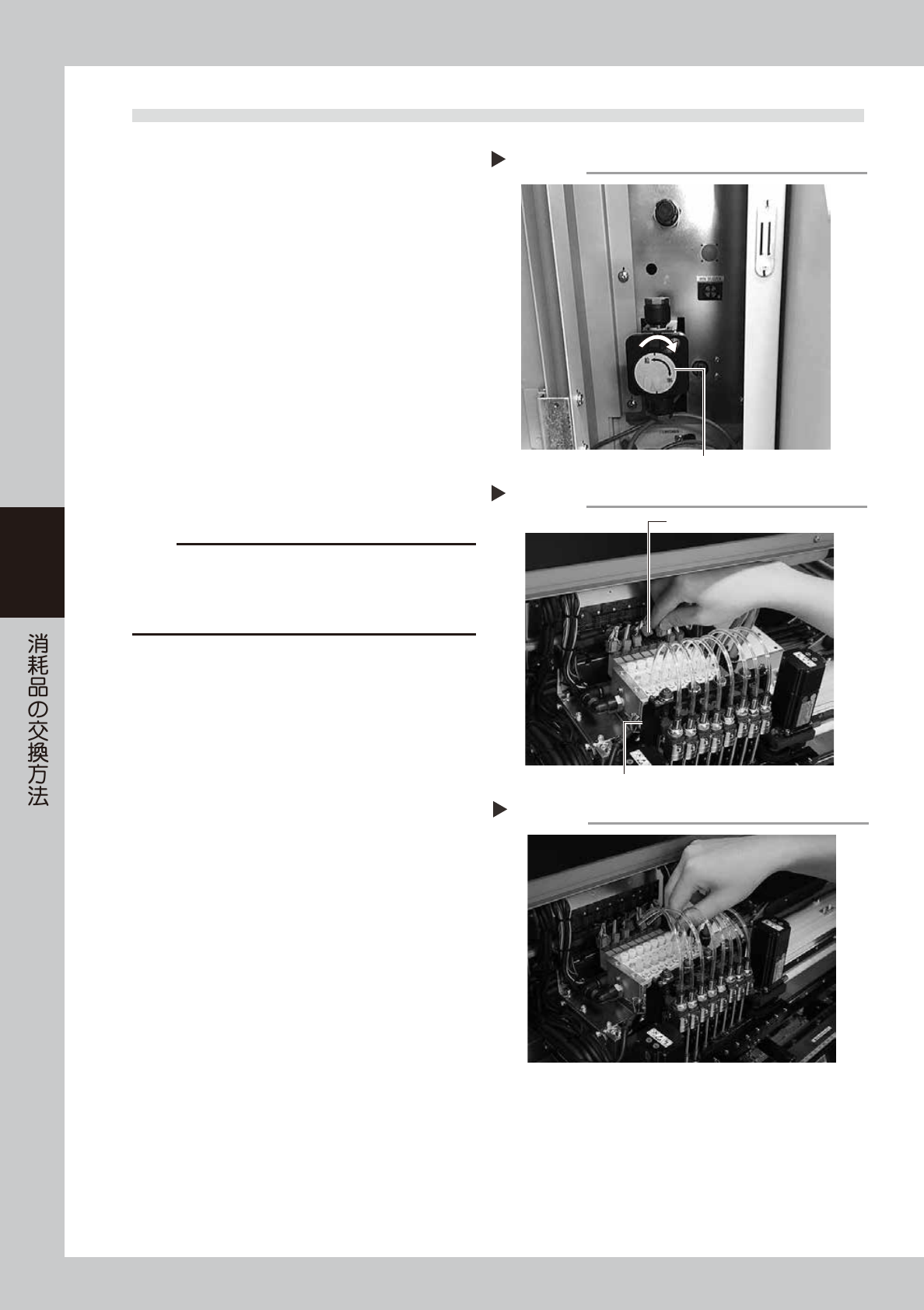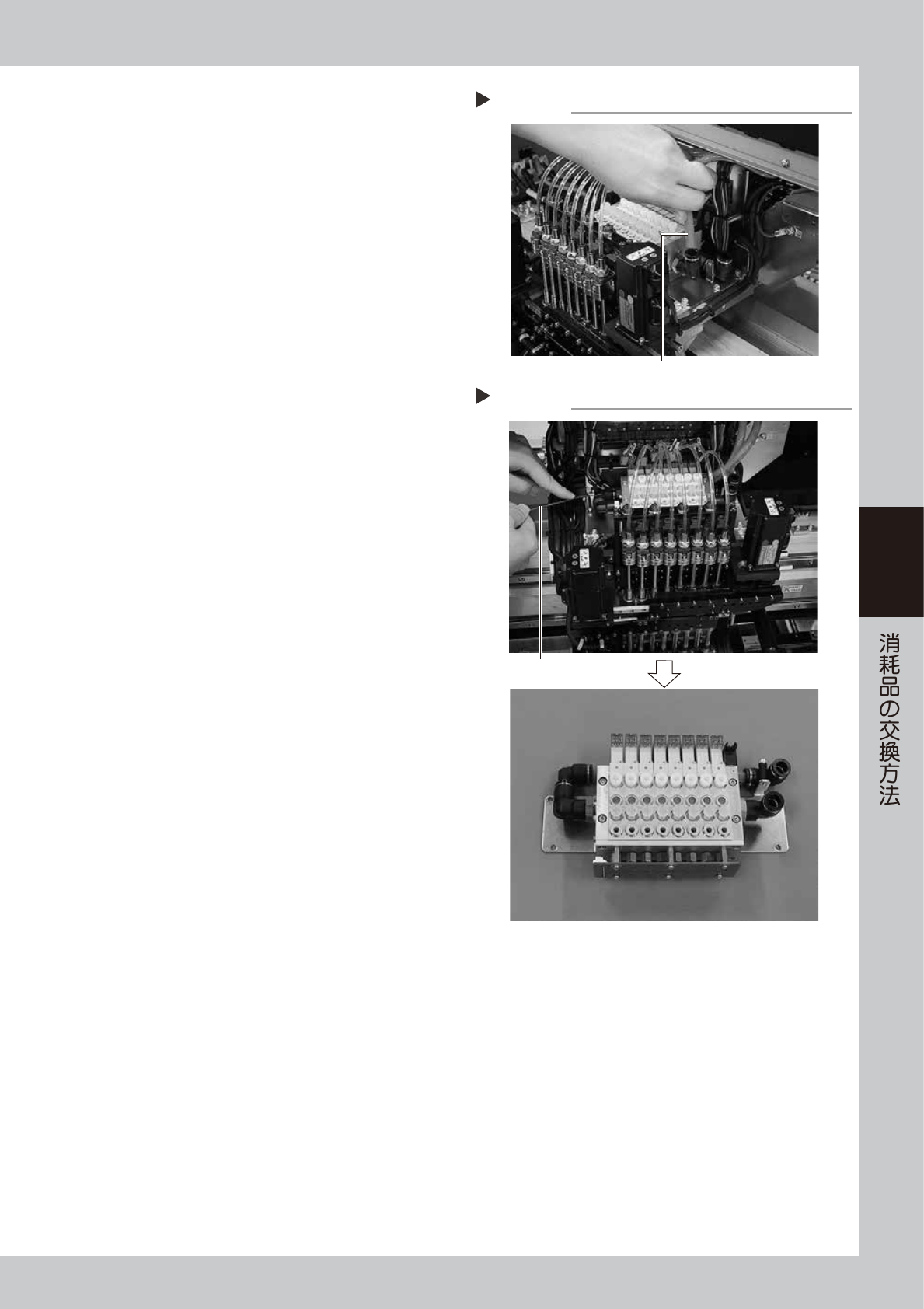 4-6 4 3.2 バルブ ( ソレノイドバルブ ) の交換 1 マシンの電源と供給エアを OFF します。 1. ソフトウェアを終了してマシンの電源を OFF します。 2. マシン左下パネル内の「エア供給 / 排出」ス イッチを右に回してエア供給を OFF します。 51417-L1-10 2 ヘッドユニットを手前に移動させます。 マシンの安全カバーを開け、ヘッドユニットを手 前側に移動させます。 3 ヘッドバルブユニット部ハ…