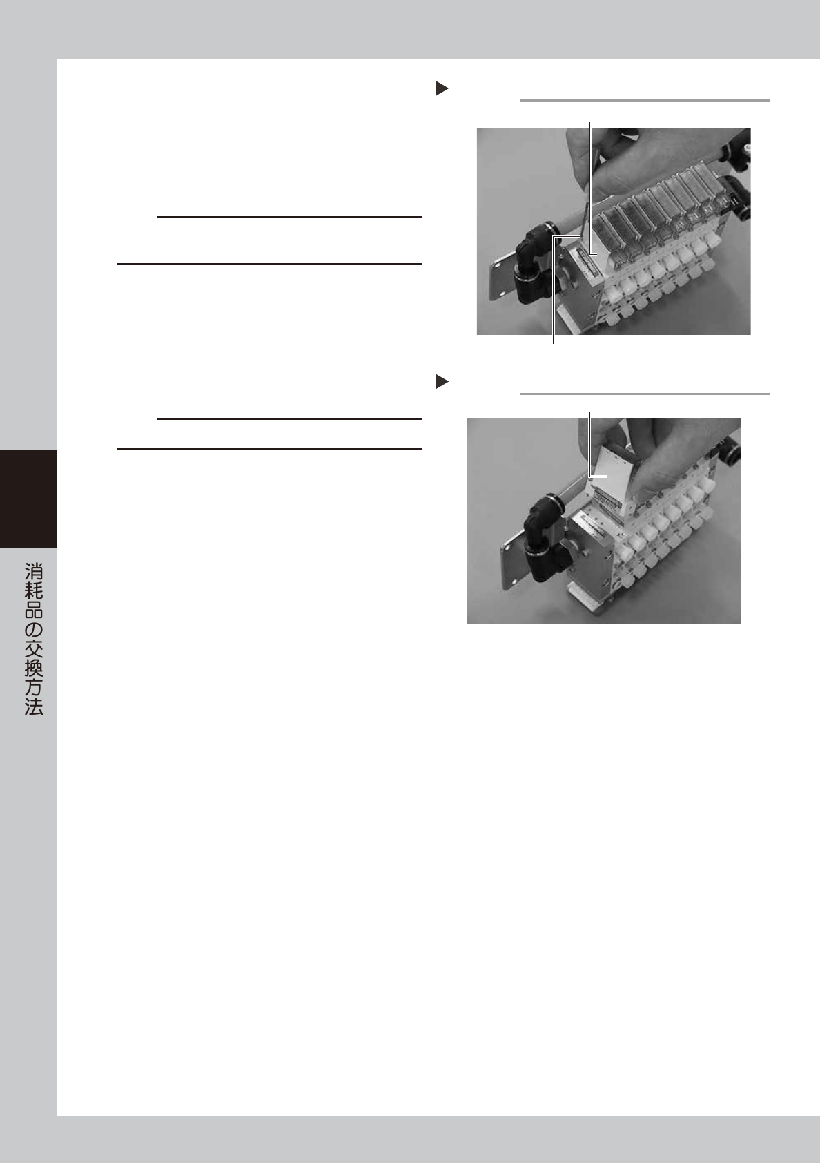 4-7 4 5 バルブユニット右側のエアホースを取 り外します。 バルブユニットの右側2箇所のエアホースを取り 外してください。 51407-L1-00 6 バルブユニットをヘッド部から取り外 します。 1. 六角レンチ (5) でバルブユニットを固定して いるボルト 4 本を外します。( ベース左右に 2 個ずつあります。) 2. バルブユニットを上に持ち上げるようにして、 ヘッド部から外します。 51408-L1-00 バルブユ…
