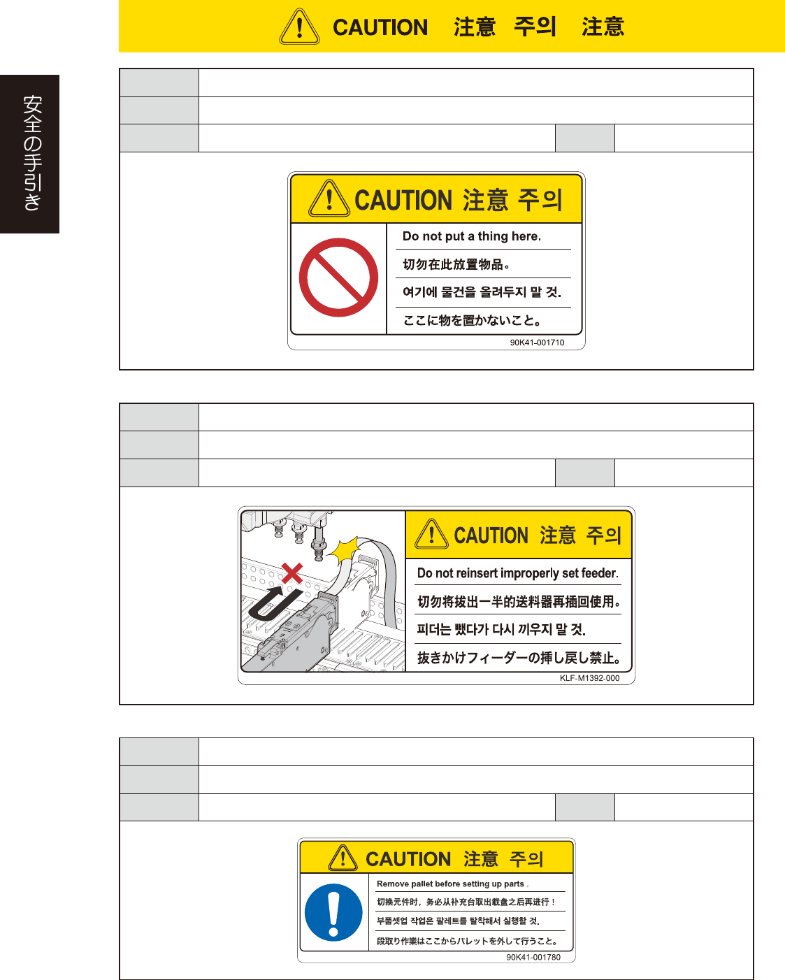 xxvii 危険の結果 マシンの破損 ( ヘッドと衝突など ) の原因となります。 危険の回避 一括交換台車の上面カバーに物を置いてないか確認する。 対 象 一括交換台車 (YSM40/YSM40R,Z:LEX(YSM20/YSM20W)) 運用段階 段取り 危険の結果 マシンの破損 ( ヘッドと衝突など ) の原因となります。 危険の回避 一括交換台車の上面カバーに物を置いてないか確認する。 対 象 一括交換台車 (YSM40/Y…