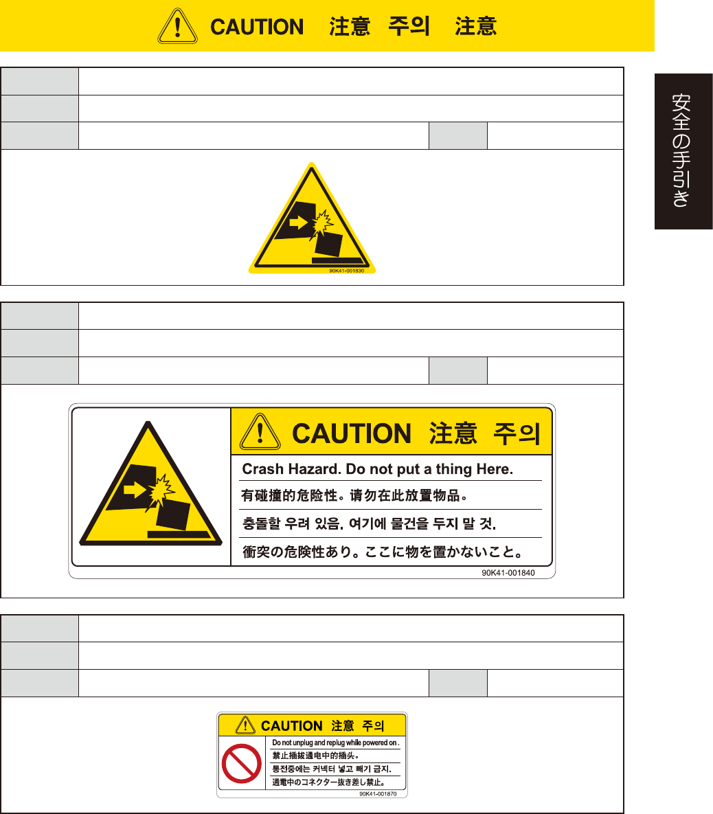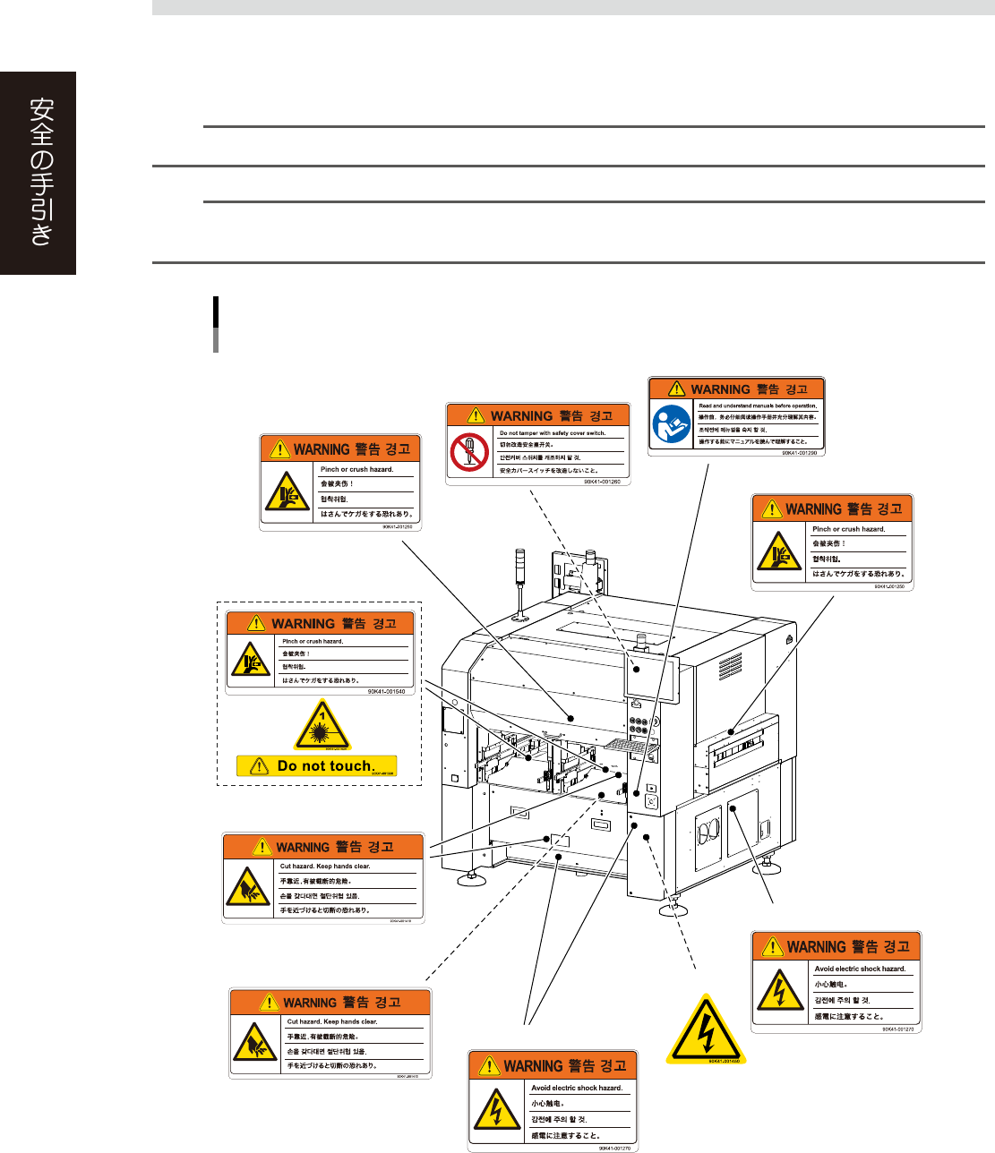 また、本項で示されているラベル以外の安全上の注意事項に関しては、「1. 安全について」を参照してください。
