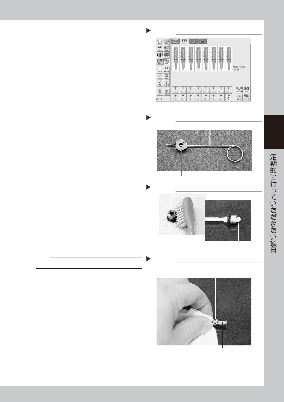 3-15 3 4 スプラインシャフト内をエアブローし ます。 [ 装置 ]- 「ヘッド」画面で各ヘッドの [ ブロー ] ボタンを押して、スプラインシャフト内をエアブ ローしてください。 52303-L1-00 5 アルコール容器から部品を取り出して、 清掃します。 1. ノズルブロックは、ニードルピアスなどで穴 の内部を清掃します。 51320-L1-00 2. べベルギアは、ウエス、歯ブラシ、綿棒など でギア部、穴部、表面を…