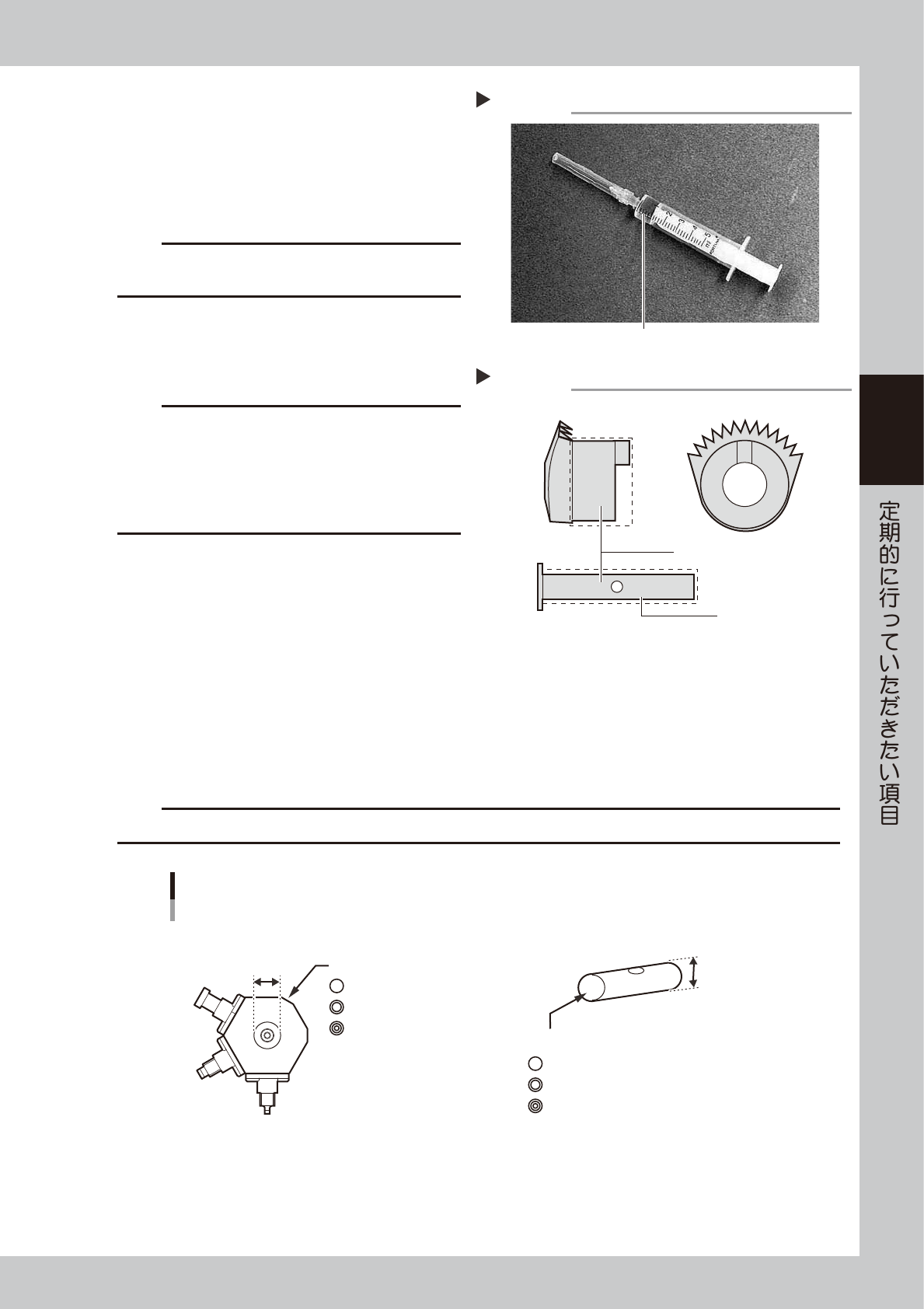 3-17 3 r ベベルギア、シャフトに給油します。 ノズルバフィング部給油用シリンジとタービン油 (VG32) を使って、ベベルギアの内側とシャフト にそれぞれ 1 滴給油し、指で伸ばします。 51326-L1-00 51327-L1-00 c 注意 ベベルギアのギア部には給油しないでください。異物が付 着すると、挟みこむ可能性があります。 t FNC ノズル ASSY を組み立てます。 プラスドライバーを使用して、ノズルを元どおり…