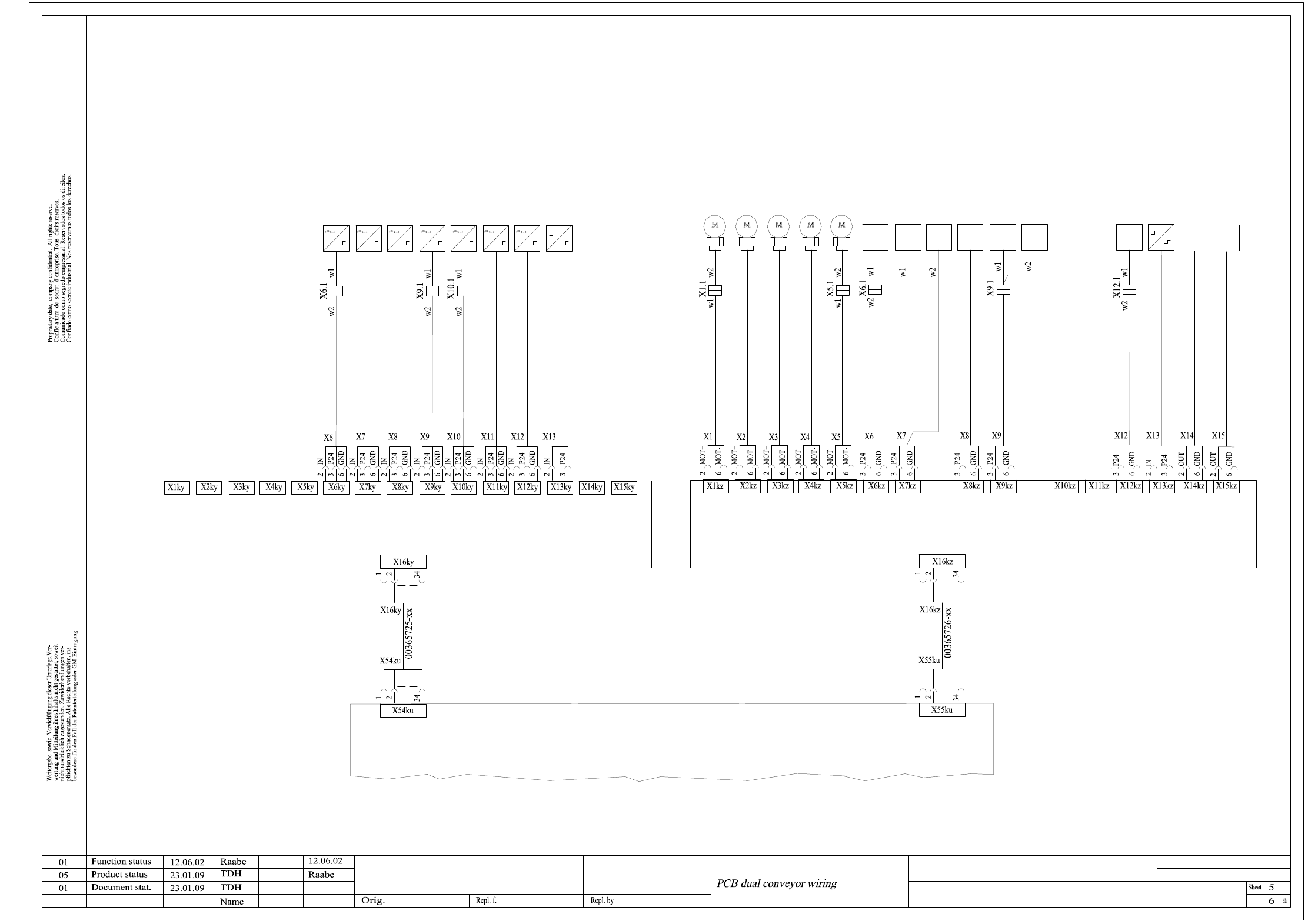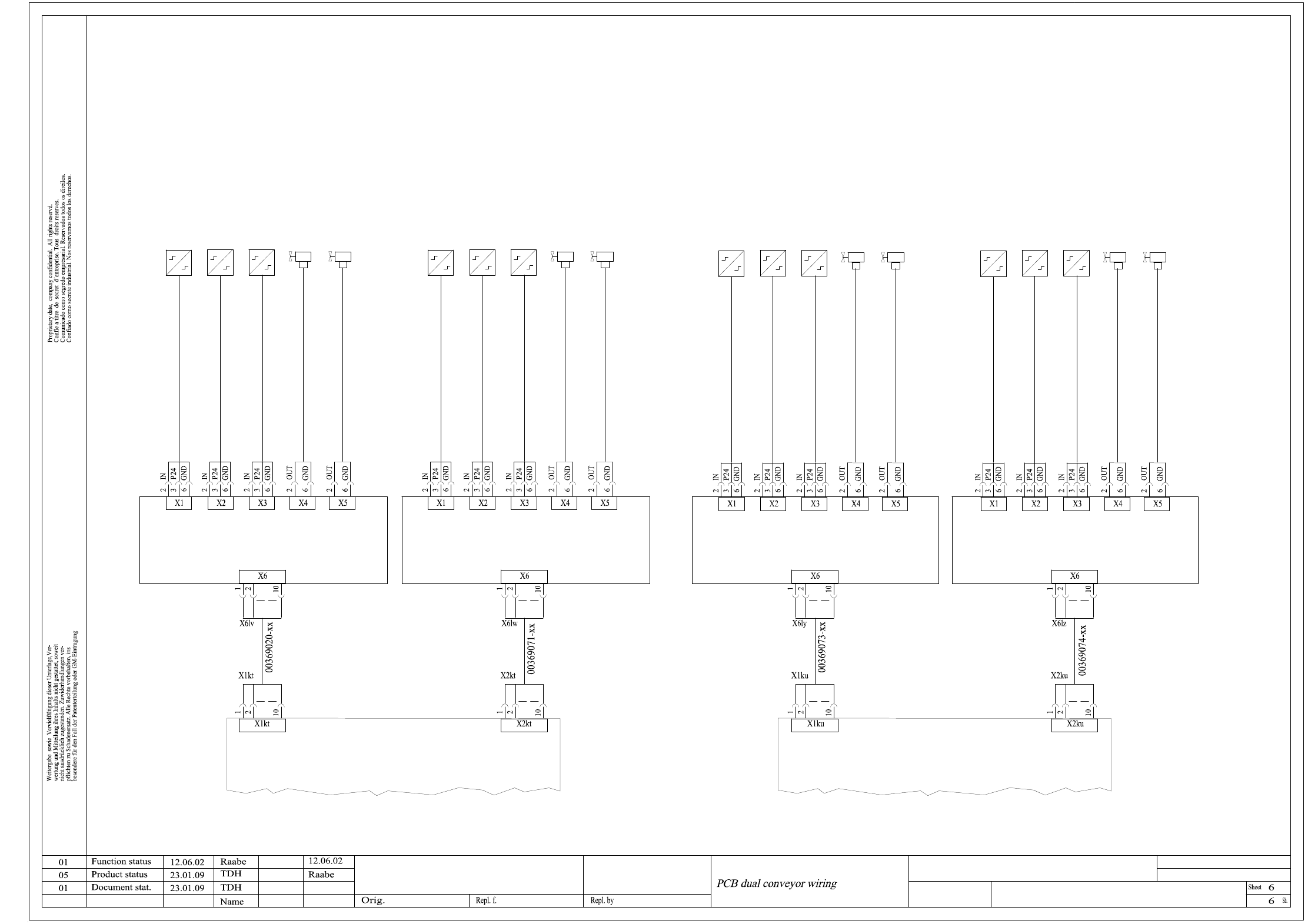 1 - 36 001 19 627-0105 01LD3 V erd rahtun g Doppel transport (Bl. 5 v . 6) PCB du al conveyor wiring (sh . 5 of 6 ) Dat e Aut hor Check. Stand. Sta tus Mo difie d Date Conv ersion board, assemb l y troug h, track 2 Conve…