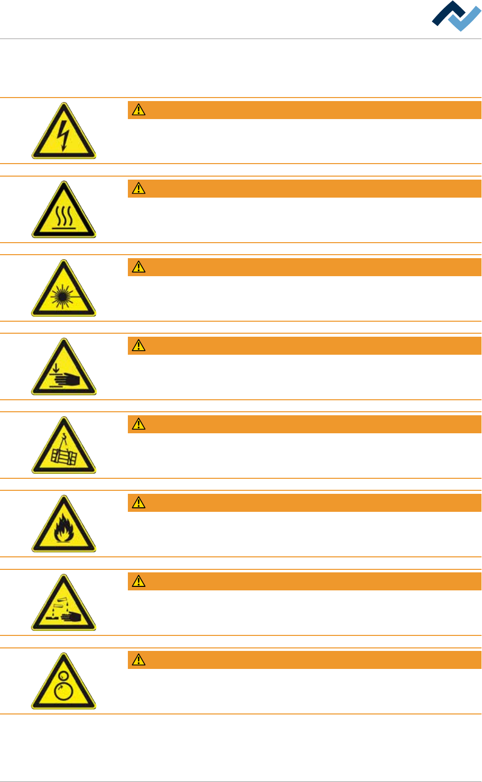 1|Introduction 1.2.5 Warnings We use the following pictograms for warnings: WARNING Dangerous electrical voltage! Danger of electrocution! WARNING Hot surfaces, hot gases! Burn hazard! WARNING Laser beam! Risk of retin…