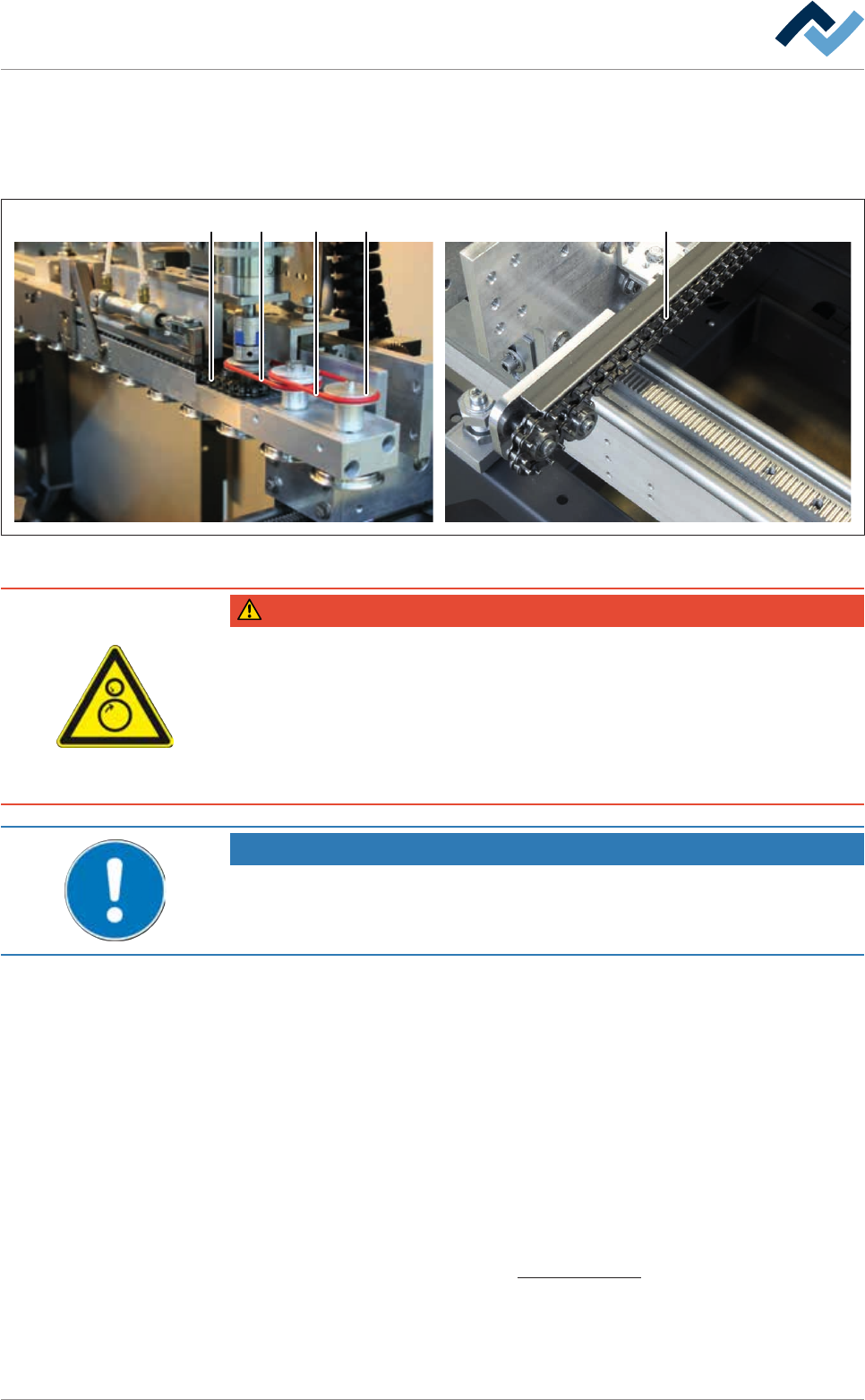 c) Keep fingers away from moving parts (transport chains, gear wheels, gear racks)!