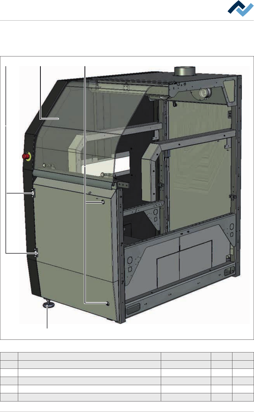 9|Spare and wear parts 9.2.2 Base Module 900 1 3 2 4 Fig.143: EM113-10-00 Pos Designation Item number A B 1 Safety glass plate module 900 189028 x 2 Hinge EMKA Type 1110 93324 x 3 Lock 6VER2520 x 4 Adjusting foot 6STE…