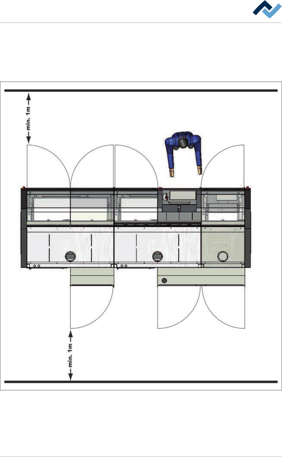 With open doors and hoods, a 1 metre wide passageway is required in front of and