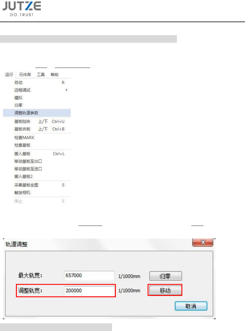 第五章 设备 操作选项设定 V 7.0.4584.0-1 www .jutze. com.cn 25 / 39 5.5 双轨设备轨道 宽度调 整和轨 道参数设 定 5.5.1 双轨示意图 5.5.2 调整轨道宽度 注意:执行 以下操作前务 必清空轨道, 避免轨道移动 导致异常情况 。 5.5.2.1 点击主界面菜单指 令栏运行 - 调整 轨道参数。
