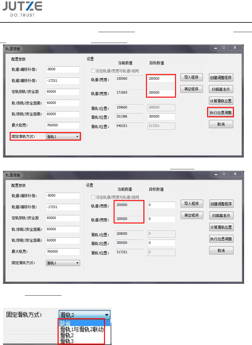5.5.2.2 弹出轨道调整界面,先选择固定滑轨方式,其次在轨道 1 宽度和轨道 2 宽度的目标数