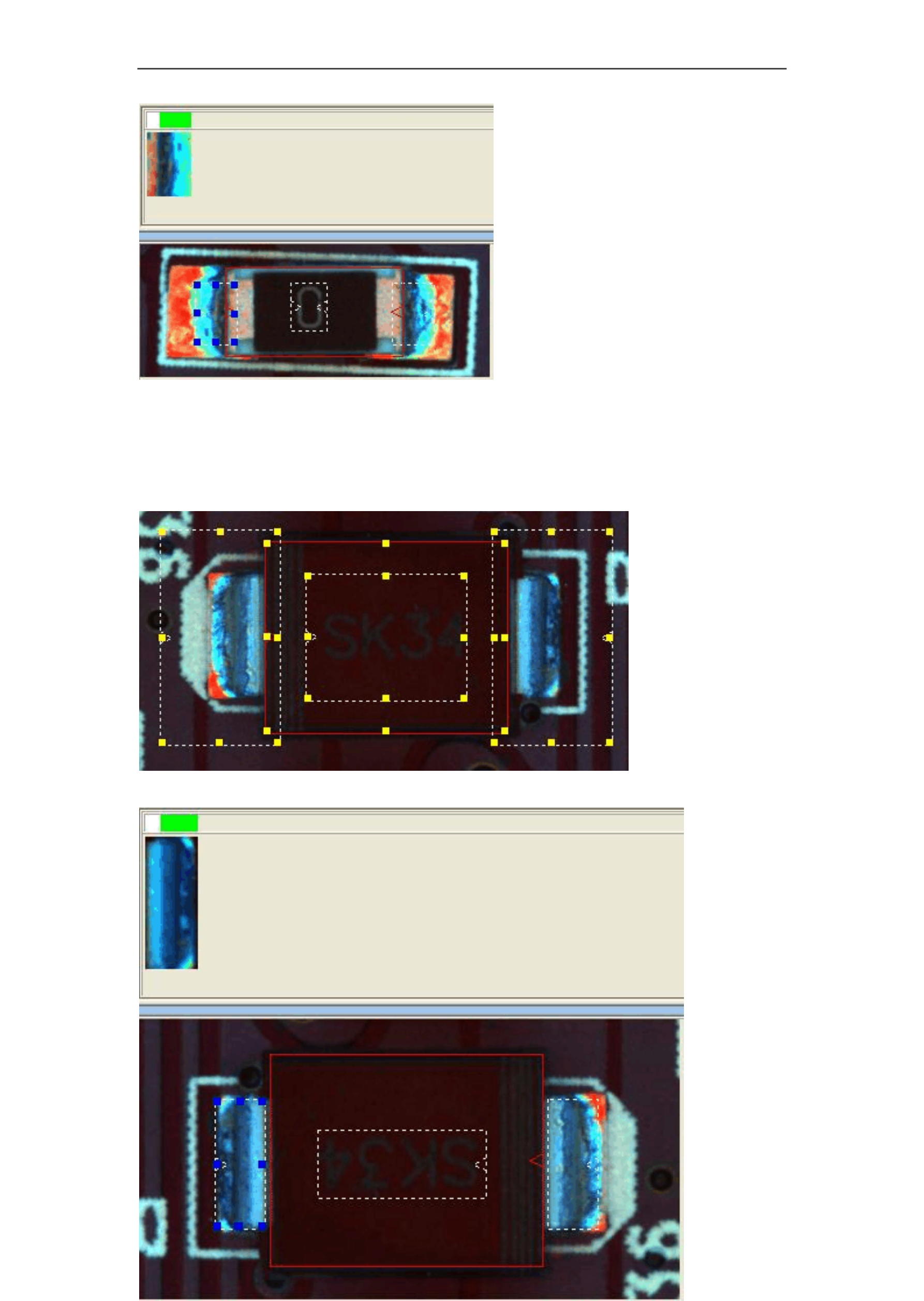 ( 3 )极性二脚件 极性二脚件的画法与电阻的画法完全一样, 只是选择画框的类型上比电阻多了一个方向检测 选择元件工具栏的极性二脚件框, 因极性二脚件有方向, 在画框时从没有极性标致一端的角 上拉向对角 , 让本体框框住元件本体, 此时可以看到 元件框的极性标致的红三角箭头与元件 本身的极性标致在同一方向 ,方便测试时观查,也有利于程序修改。 接下来的画框就与电阻完全一样