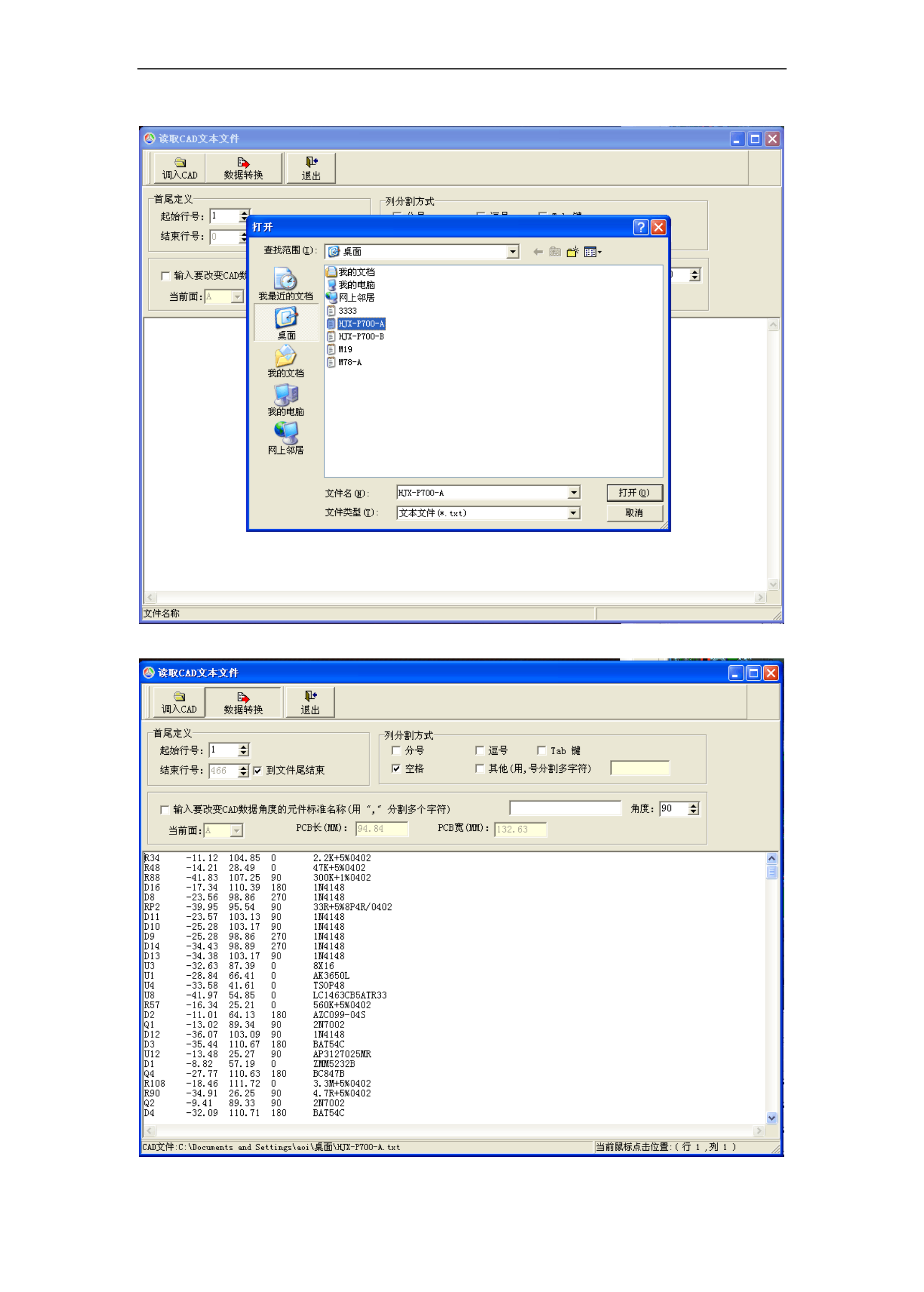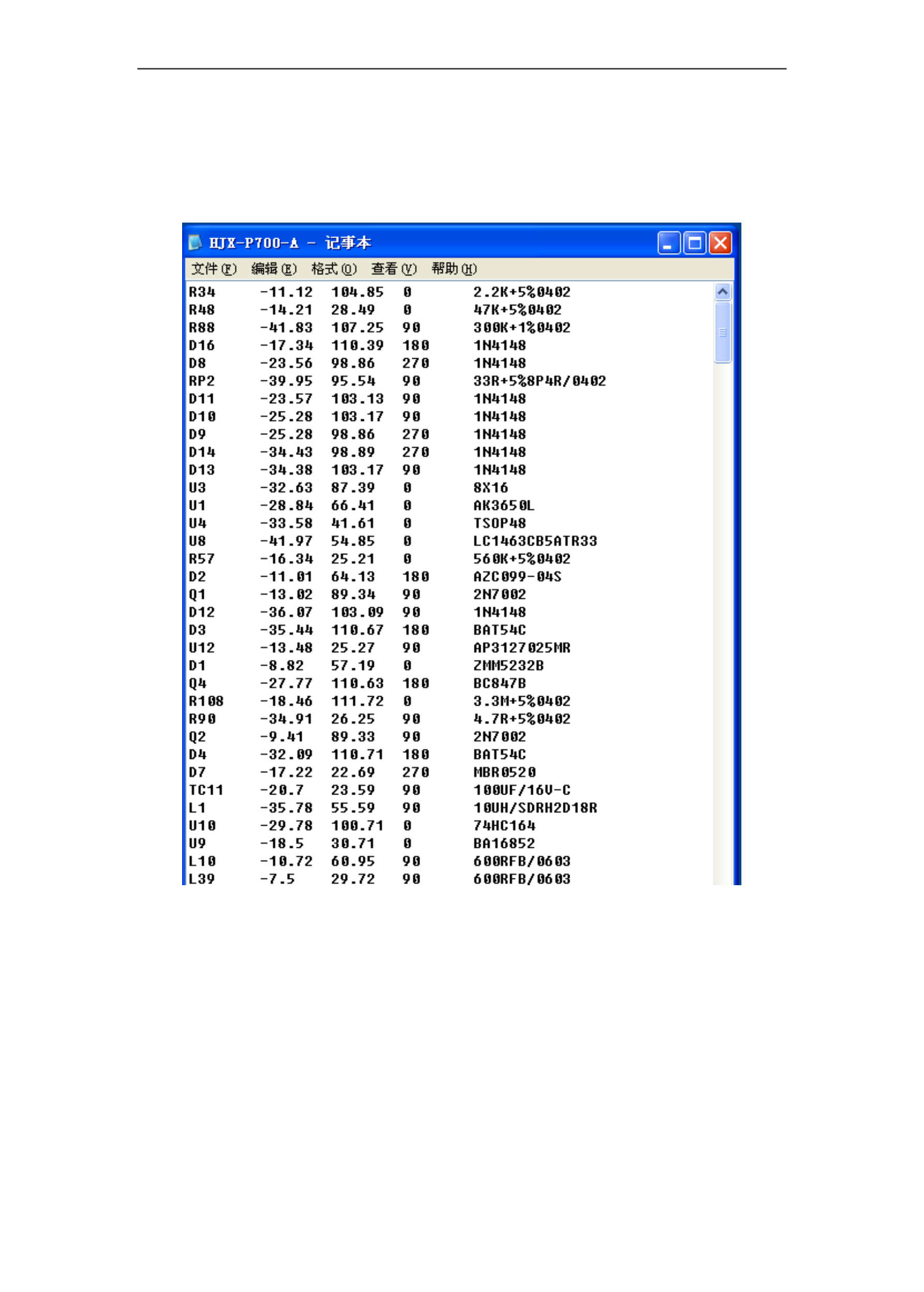 标、Y 坐标、角度以及元件料号五组数据信息。从贴片机中导出的数据信息用文本文档的格