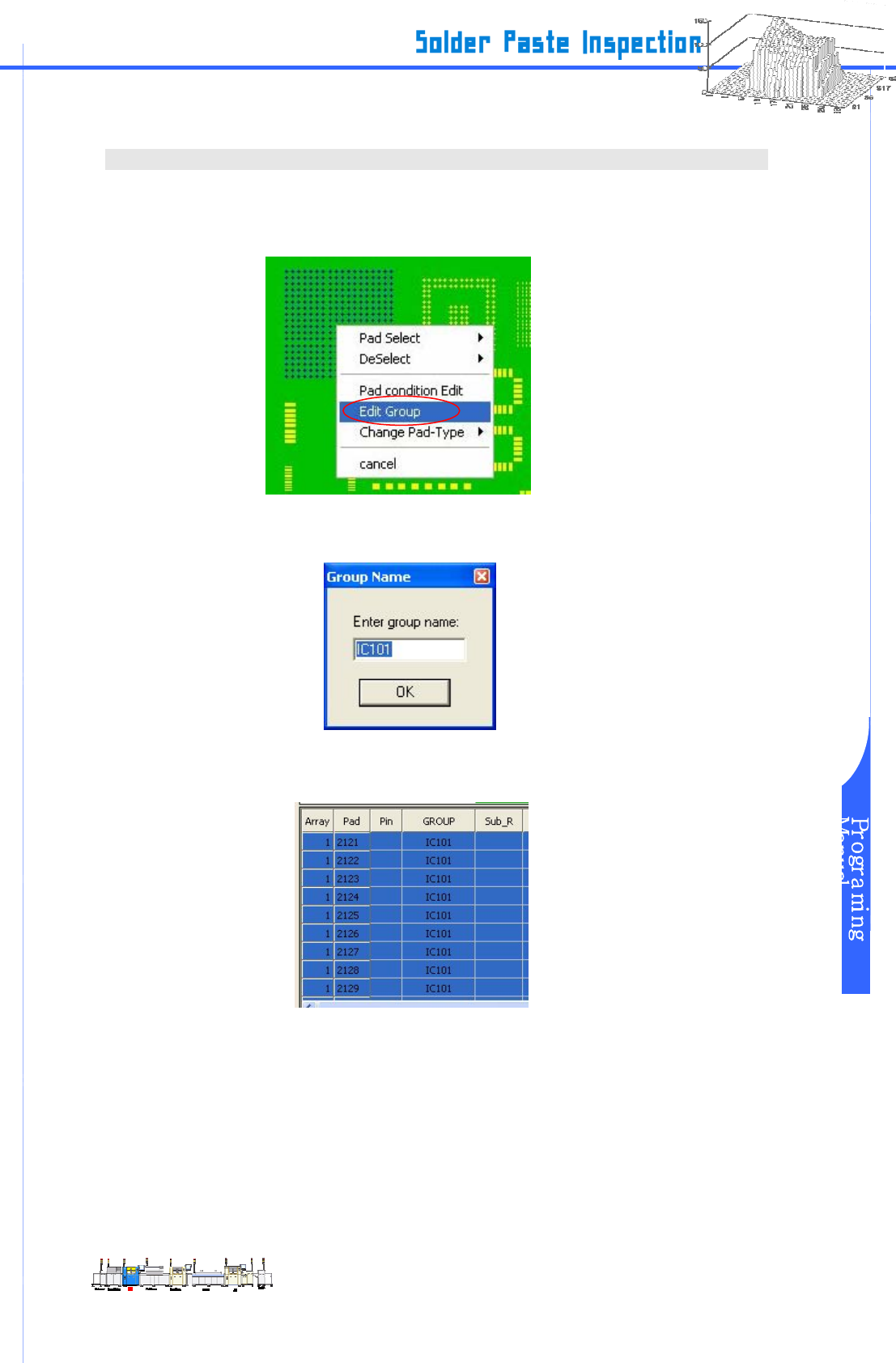 www.pemtron.com 31 III-4-3 输入参照名操作程序 步骤 1 : 本单元介绍如何 设置参照代码名。 用户可以手动输入参照代码。 请选要输入参照代码名 的 Pad 。按右键打开菜单后,单击 “ Pad.CodeEdit ” 。 图 III-4-10 点选 “Pad.CodeEdit” 步骤 2 : “ CODE EDIT ” 对话框弹出后,输入参照代码。 图 III-4-1 1 “CODE EDIT” 步骤 3 : …