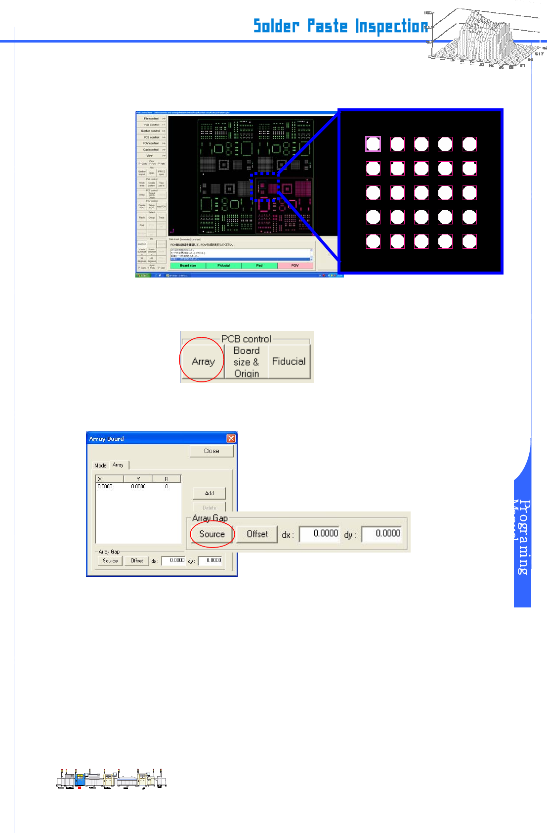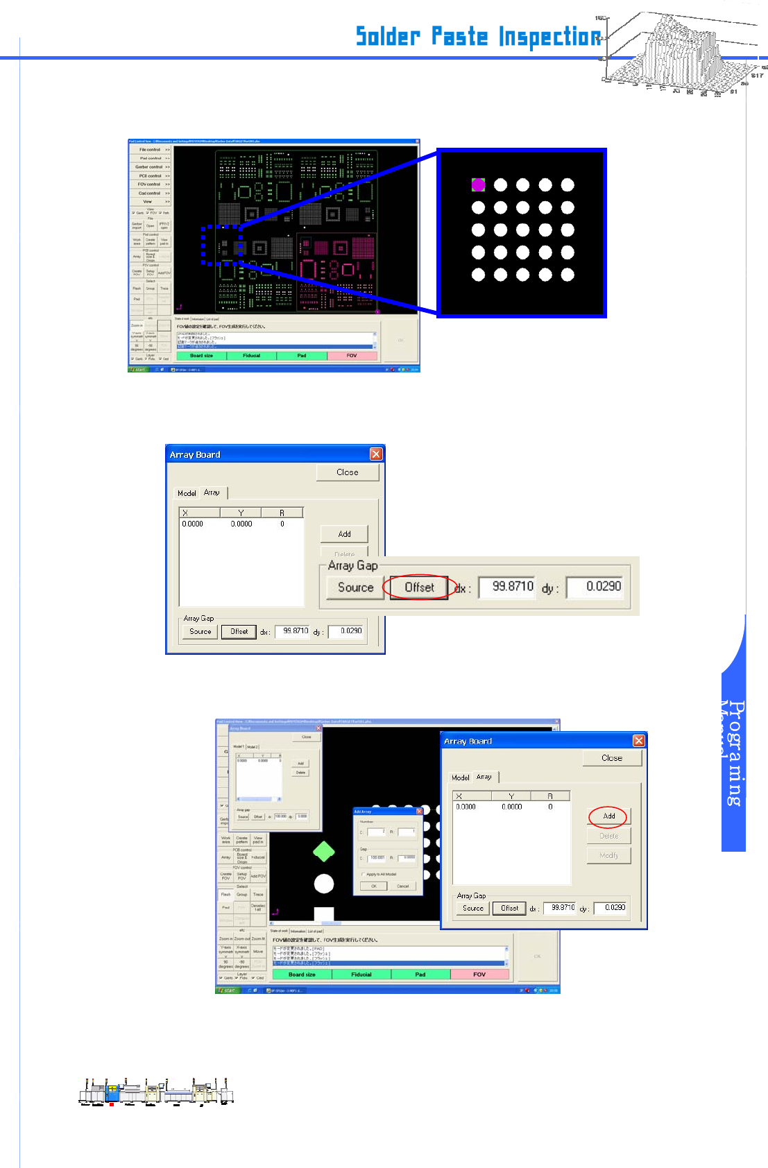 www.pemtron.com 34 步骤 6 : 选取同“ Array ”输入一致的焊点区域 St e p 3 . 点选 “ Flash ” 或 “ Tr a c e ” 后拖动鼠标,以便设置。 图 III-5-6 Array 导入 – Pad 设置 图 7 : 在 Arr a y B oa rd 设置对话框的 Array gap 窗里单击 “ Offset ” 键 。 图 III-5-7 Array import – Dat a s…